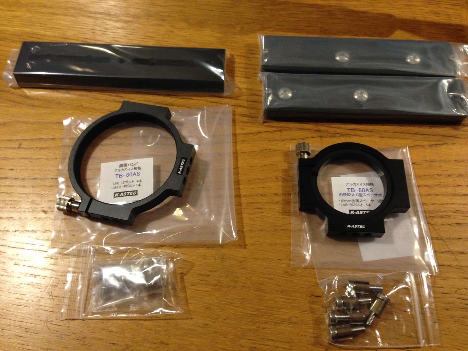 前後の鏡筒バンド「FS60CB用TB-80/60AS鏡筒バンドセット」と169mmのアルカスイス互換のプレートが2枚、180mmのVixen規格のアリミゾが1枚です。