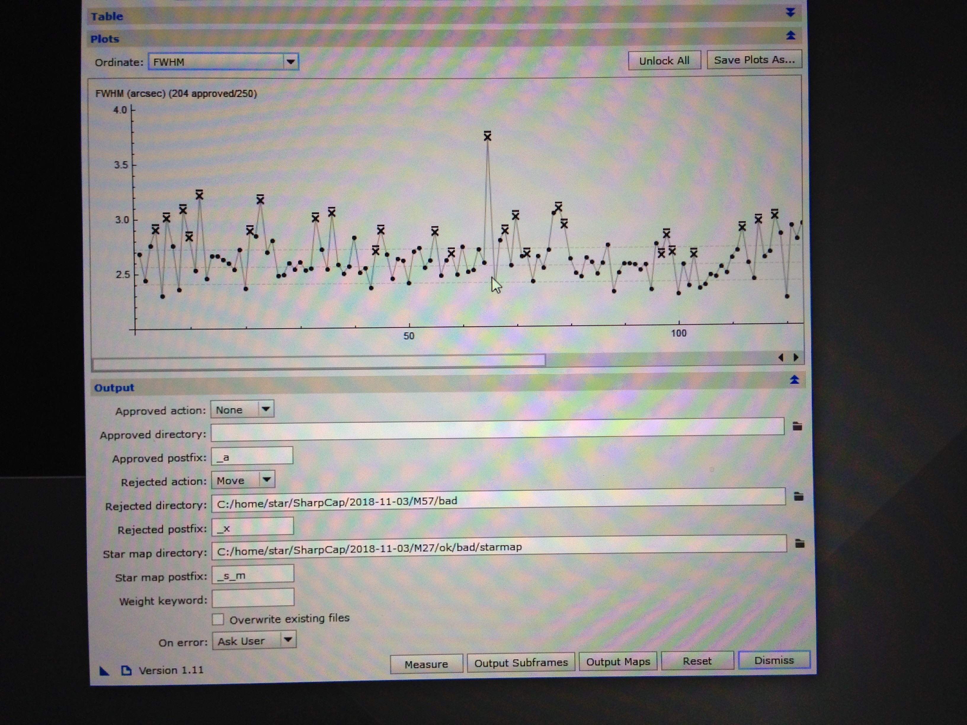 今まで電視ではあまりみたことのないM33も見てみました。ただしこの時に失敗したのが、天頂付近を見ようとしてカメラのケーブルが三脚に引っかかってスリップしてしまい、アラインメントがずれてしまったことでした。でもこれ、暗いとずれたのに気付きませんね。導入に失敗し、マニュアルで合わせようとして周囲を探っても全く導入できなくて、そこで初めてライトで鏡筒周りをよくみてやっと気付きました。初期アラインメントを再度取り直しようやく導入することができました。