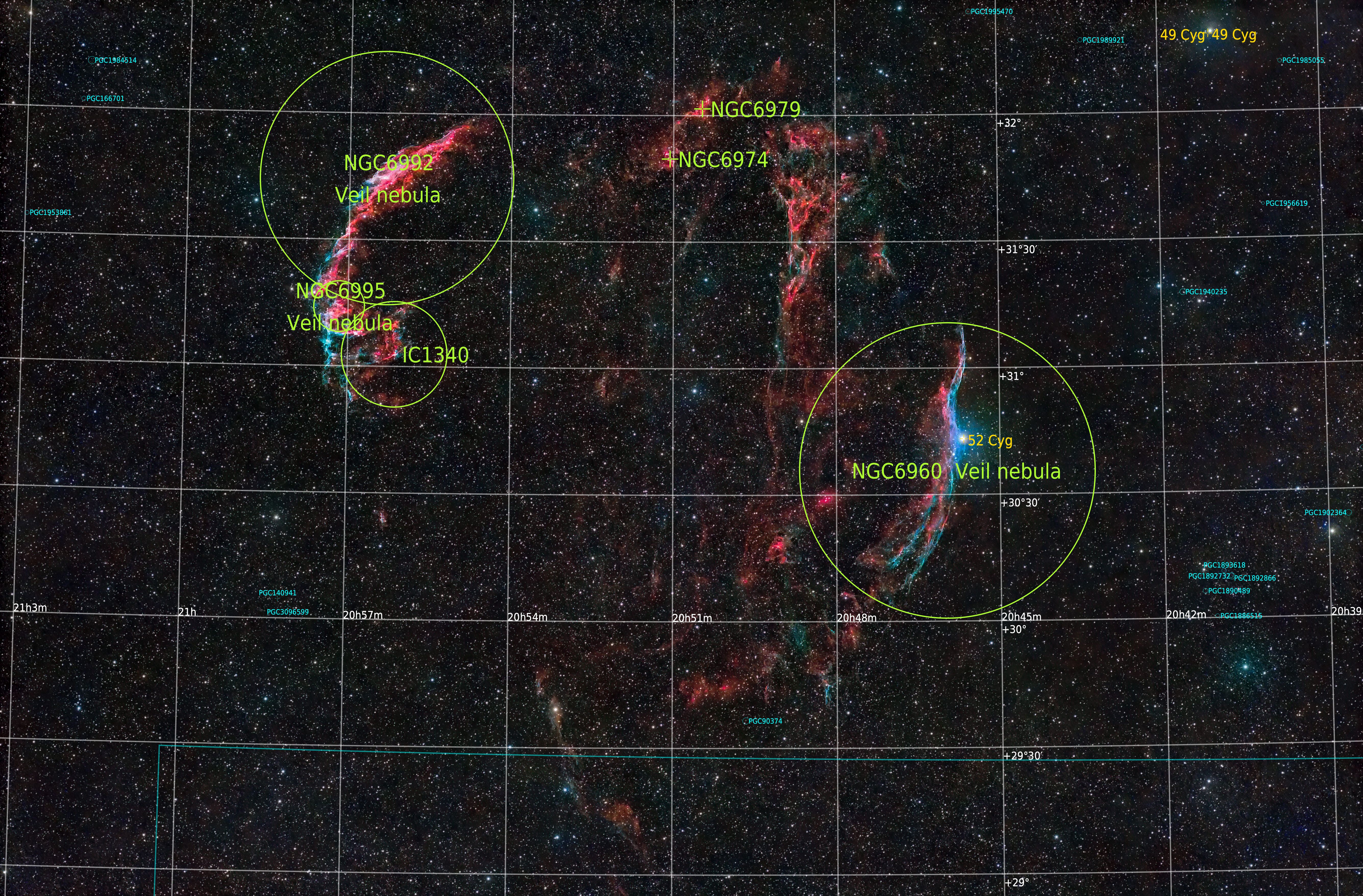網状星雲全体を入れたいので、焦点距離の短いFS-60CBにマルチフラットナーをつけて、EOS 6Dで撮ります。?(クエスチョンマーク)の形の下のところまで入れたかったので最初縦長にしようと思ったのですが、縦だと幅がギリギリなのと、西網状、東網状と言いたかったのであえて横構図にしました。