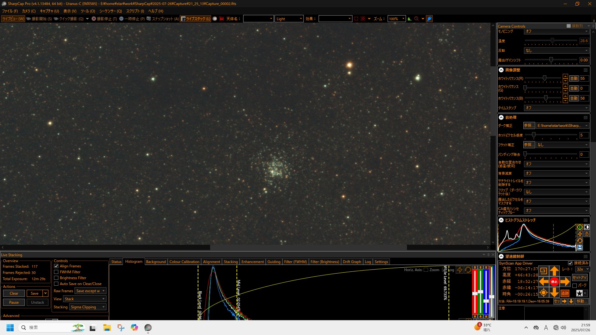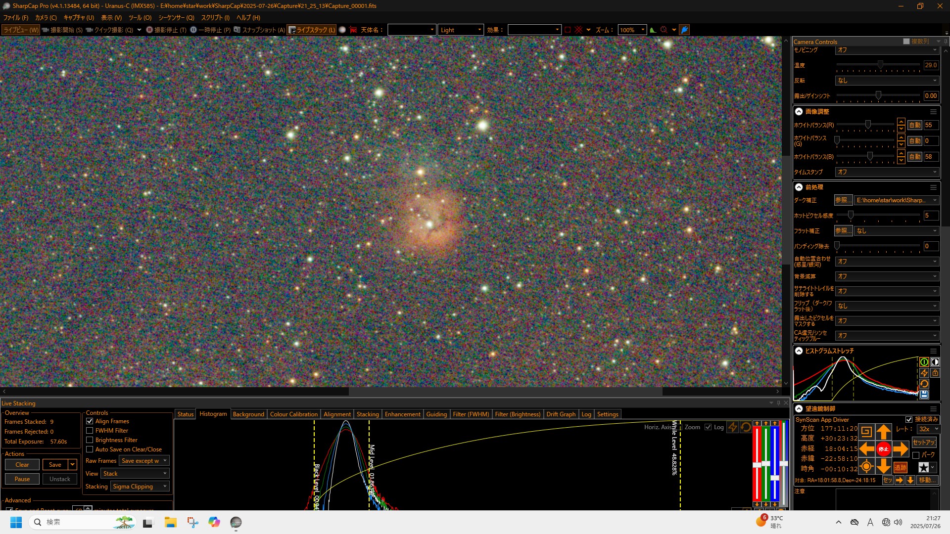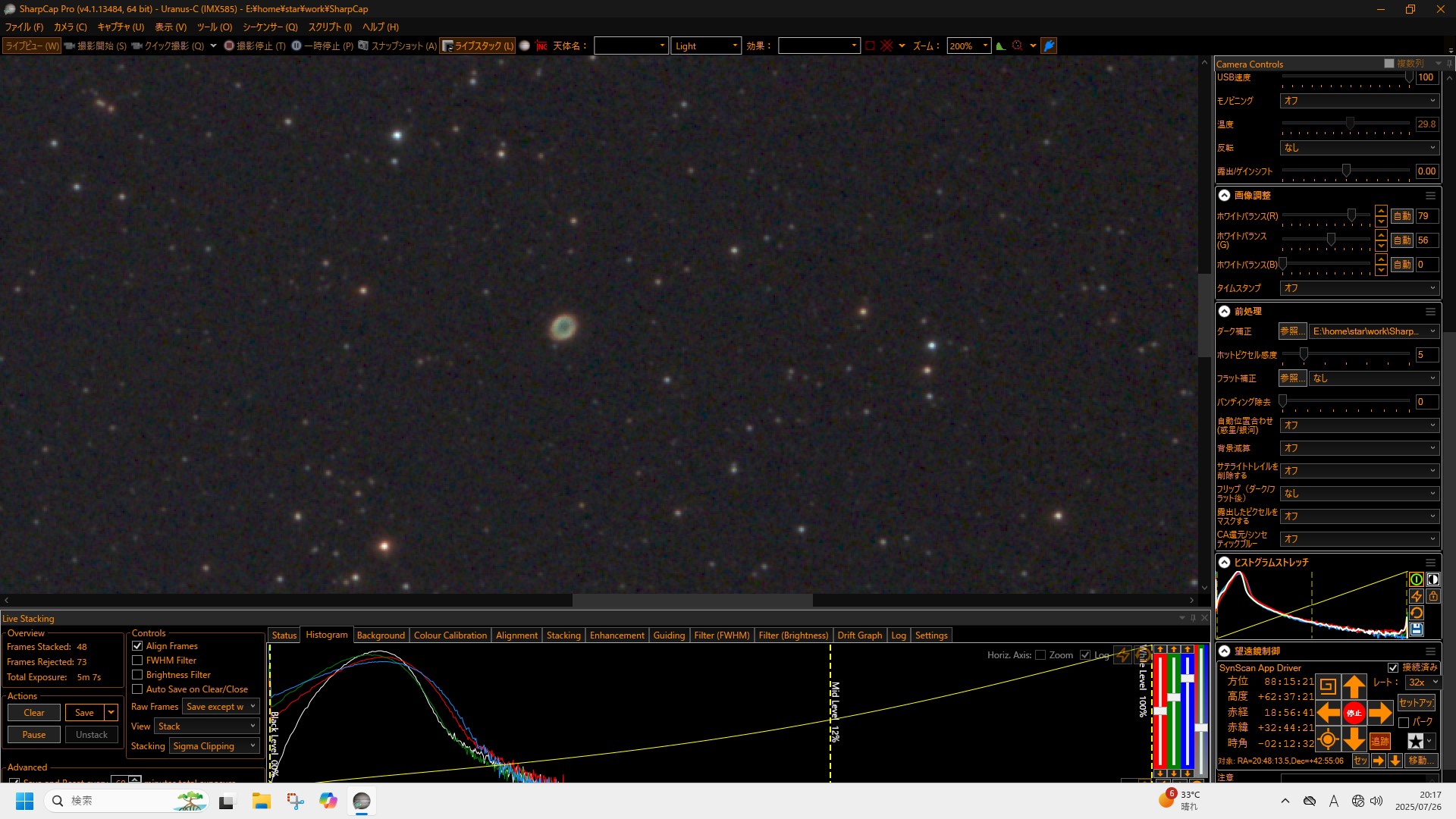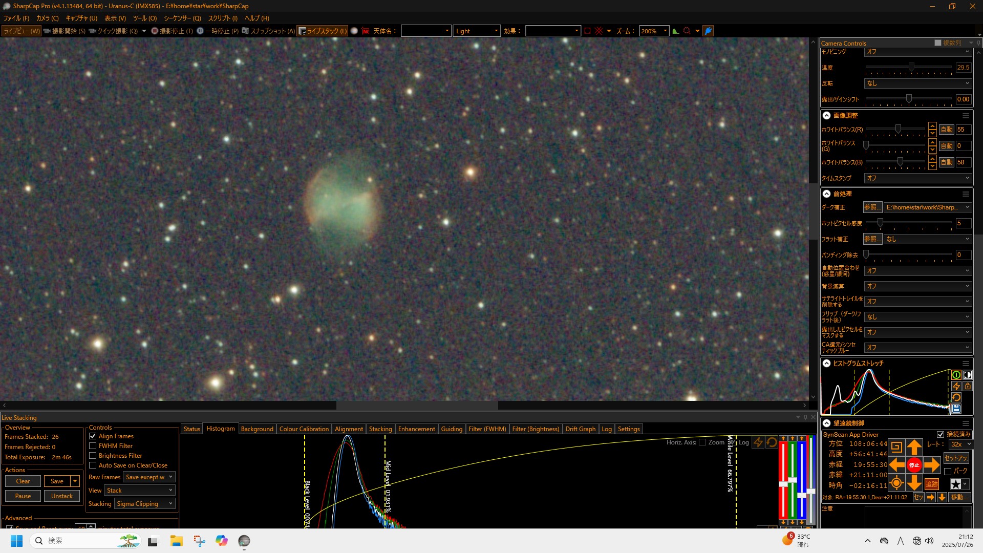 空はほとんどだめで、途中雲の隙間から何度か星は見えたのですが、せいぜいそれくらいでした。東の空は比較的晴れて、イベントの終わりの方で土星が見え始めました。21時の終了の20分前くらいになってやっと天頂方向も晴れ、最後にM27亜鈴状星雲を入れて、少しだけ見てもらい、その日は終了となりました。