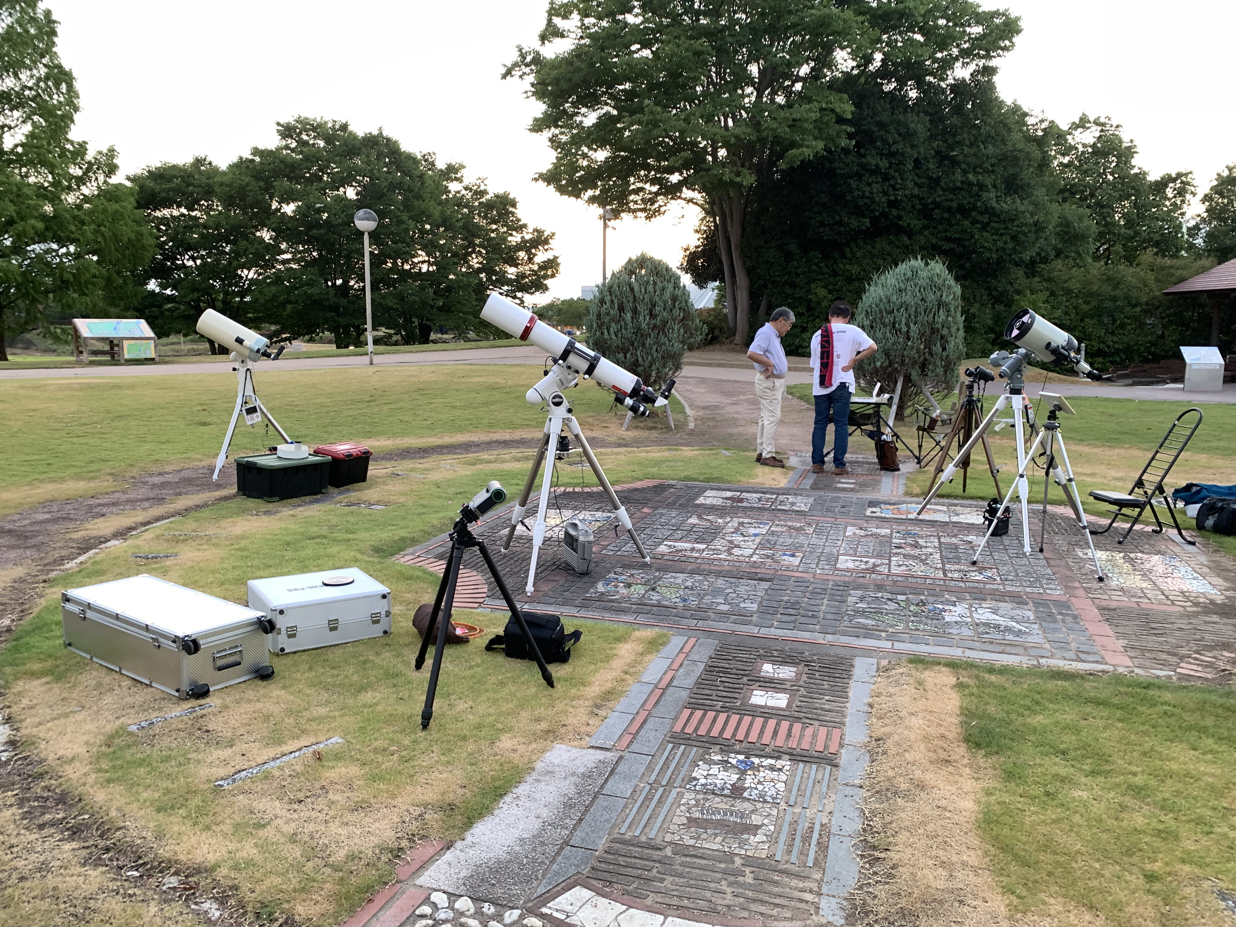 駅前の大通りで、とても明るく、周りのビルが高いこともあり視界もあまり広くないので、決していい場所ではありません。それでも土星も出始めてますし、夏なら天頂近くに電視観望で見やすい星雲などもあるので、天気さえ良ければ十分楽しめるはずです。でも、天気予報が冴えなかったこともあり、県天からは結局Sさん、Yさんと私の3人が参加しただけでした。実際最初から曇りで、途中雨もパラパラと降り、機材にカバーをかけて待っていたりという状況でした。