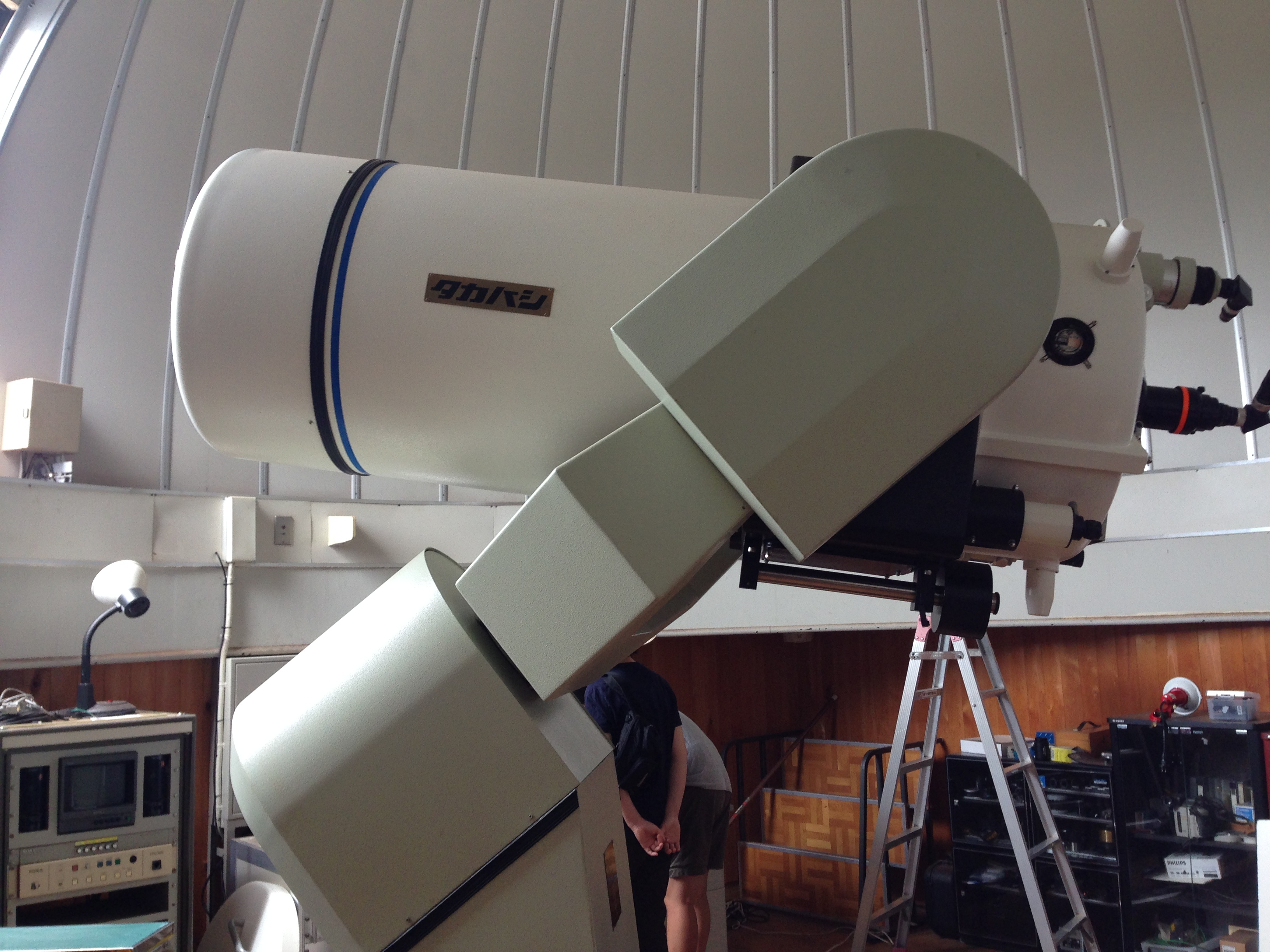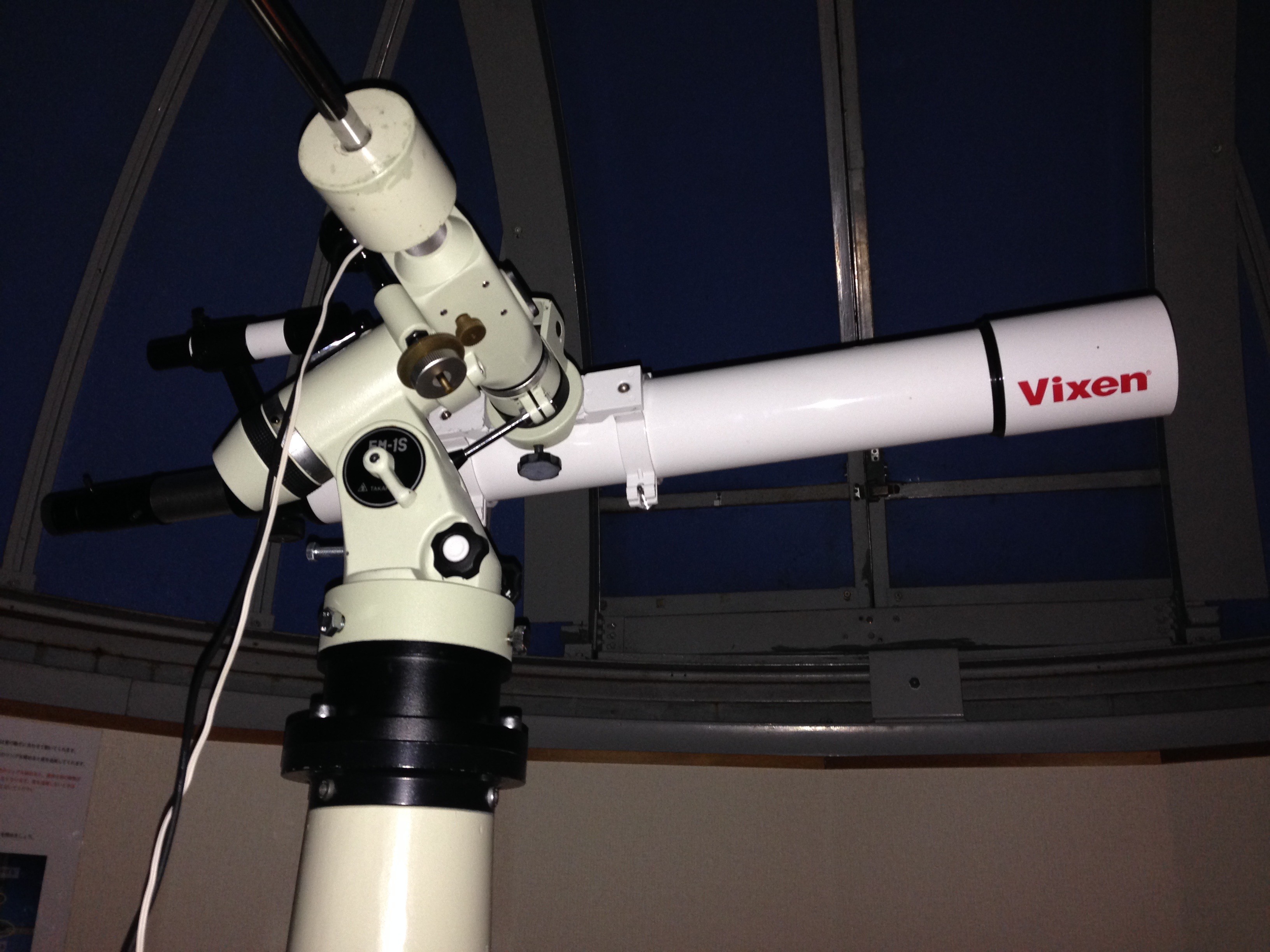 今回泊まった棟は「デネブ」。設置されている望遠鏡はVixenのPORTAで、口径80mmのA80MFmmです。それがタカハシの赤道儀EM-1Sに載っているので、本格的な観測も可能です。また別棟の「ベガ」と「アルタイル」にはFC-76クラスがEM-200に載っているとのことです。こちらは8人まで泊まることができます。残りの3棟はドームはないのですが、タカハシのティーガルがおいてあるそうです。