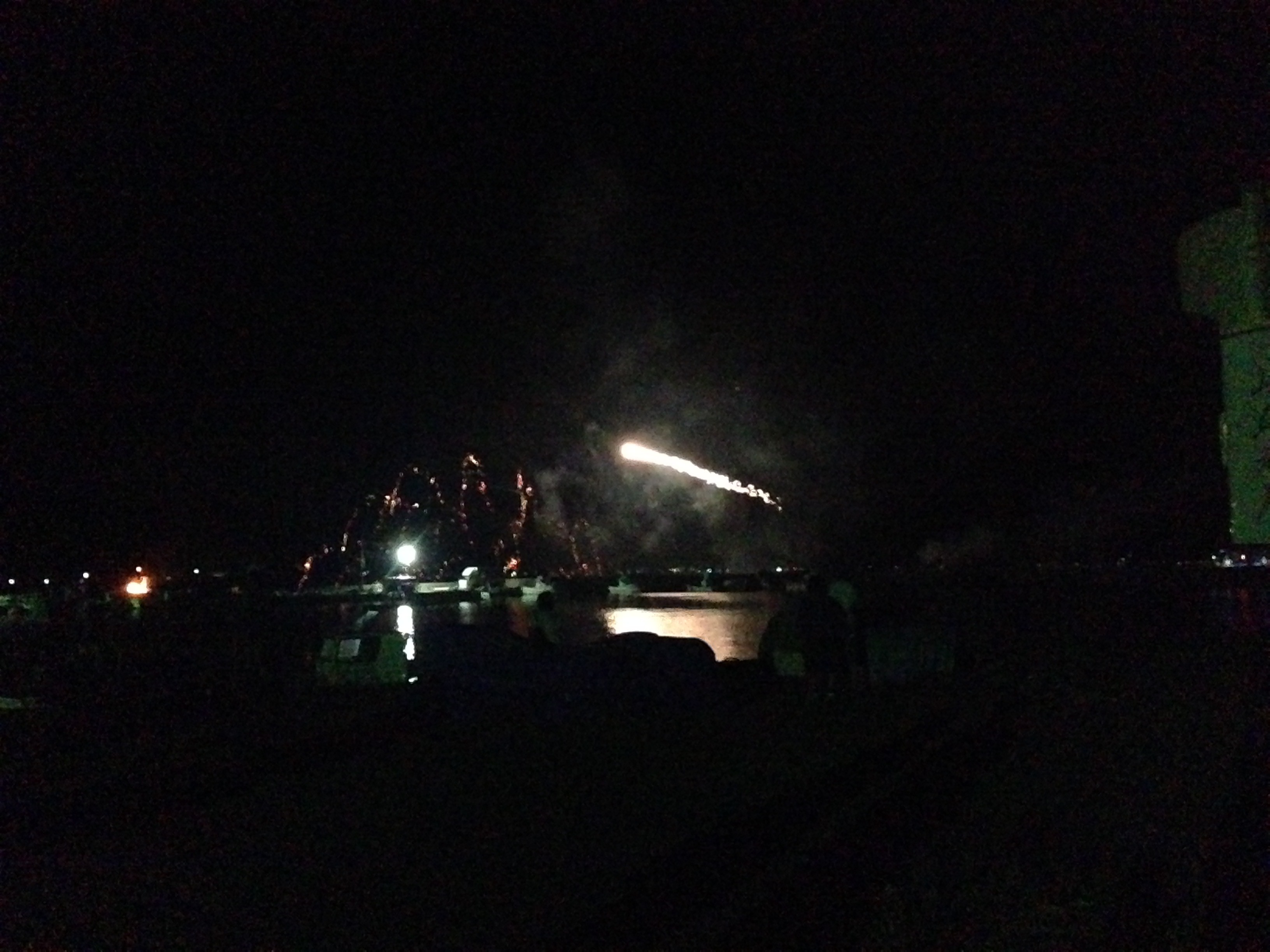 花火大会は最初いたって普通だったのですが、驚いたのは突然花火が水平に打ち出され始めたことです。最初トラブルかと思ったのですが、パンフレットを見ると「水中花火」とか書いてあるので、多分この水平撃ちがそれなのでしょう。もちろん海に向かって打っているのでしょうが、まるで花火で攻撃しているみたいでちょっと怖かったです。