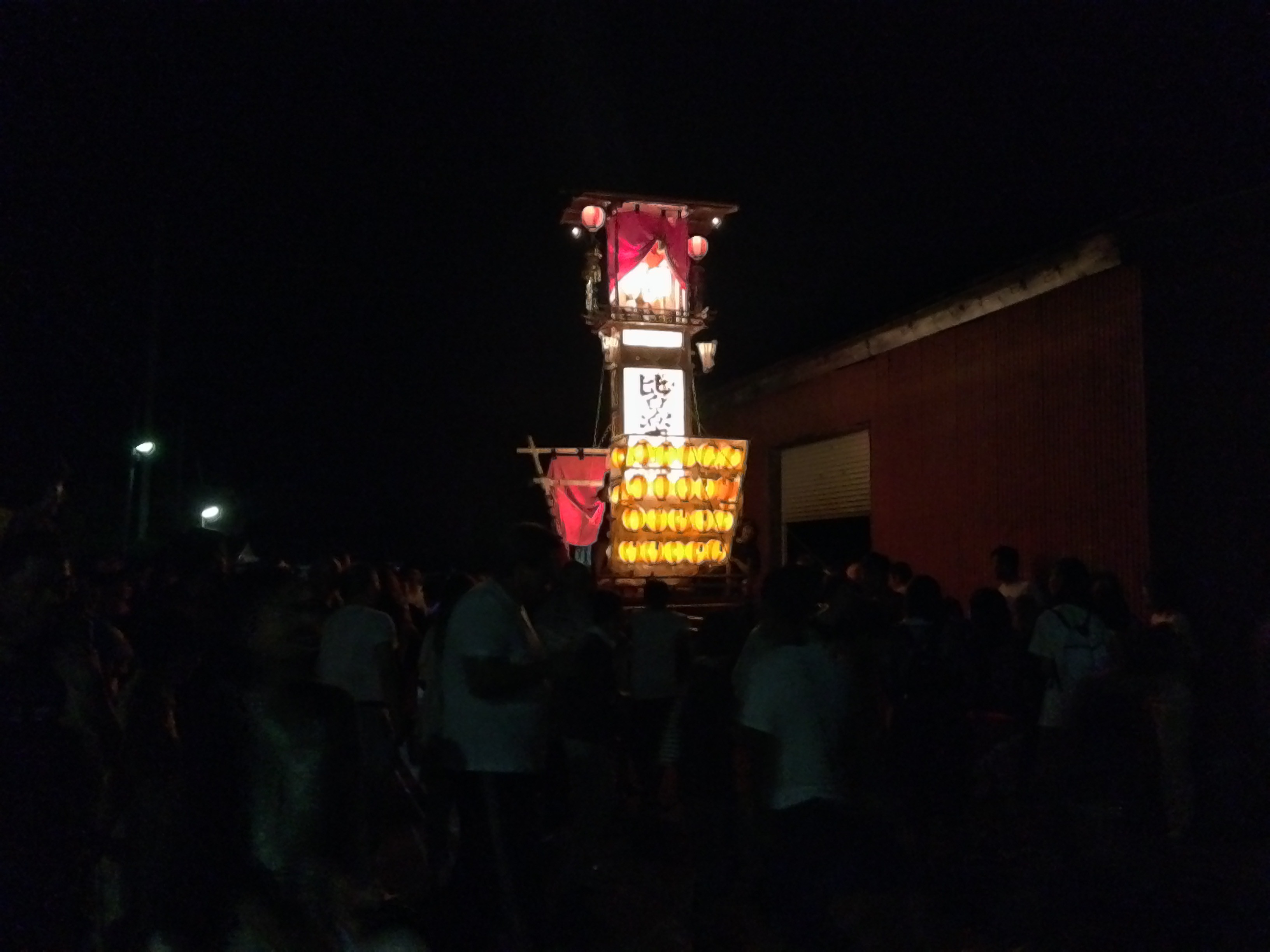 花火が終わってから、遠くの方で聞こえる「わっしょい、わっしょい」とかいう掛け声が気になって、さらに先のお祭り会場まで行きました。来ている人は地元の人ばかりみたいで、さすが海辺だけあって船の形をした山車がすごく綺麗でした。