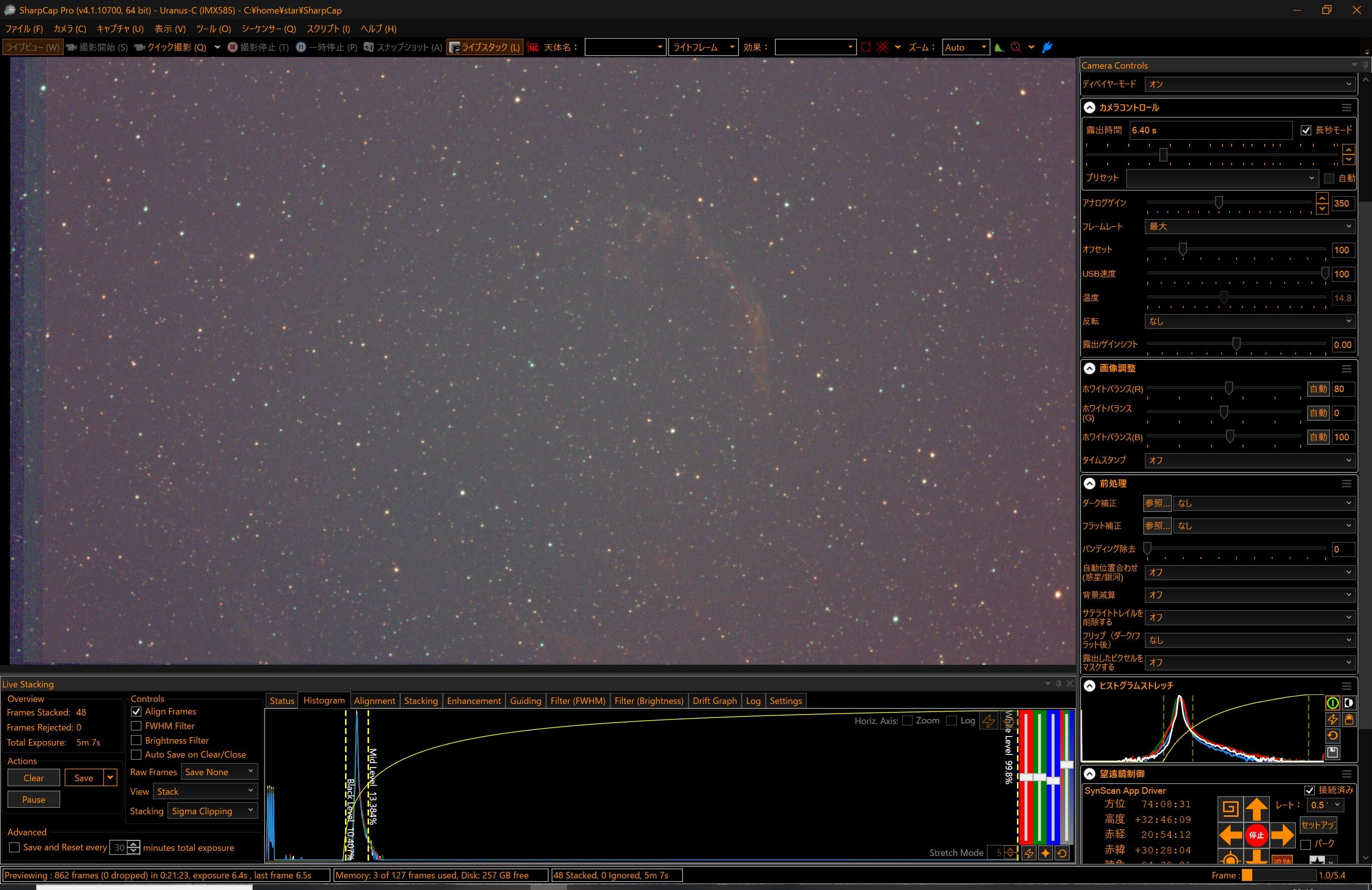 問題は、SynScan Proとの接続が安定しなかったことです。プレートソルブをかけて、基本はうまくいくのですが、何度かに一回接続が切れてしまい、それが何度もありました。接続が切れた時はエラーメッセージが出たり、エラーメッセージが出る前にプレートソルブが動かなったりしてわかるのですが、その度にSynScan Proを落として再起動すればまた普通に動くようになります。でも今回落ちる頻度が結構多くて、観望会だとお客さんを待たせてしまうレベルだったので、改善が必要そうです。一応SharpCapも、SynScan ProもASCOMプラットフォームも、SynScan用のASCOMドライバーも、全て最新バージョンですが、もしかしたらWindows PCに入っている古いバージョンの方が安定だったかもしれません。少し探る必要がありそうです。