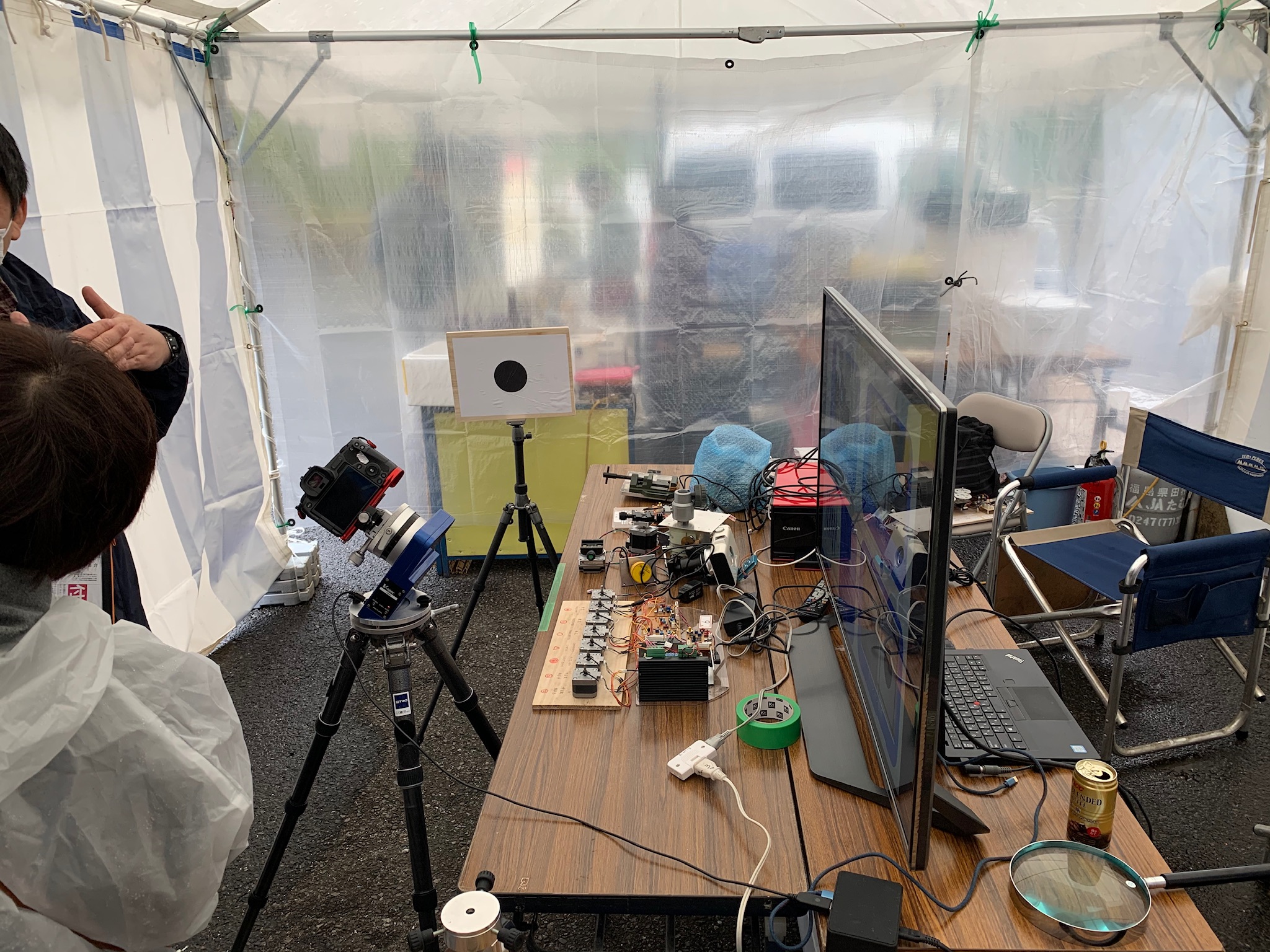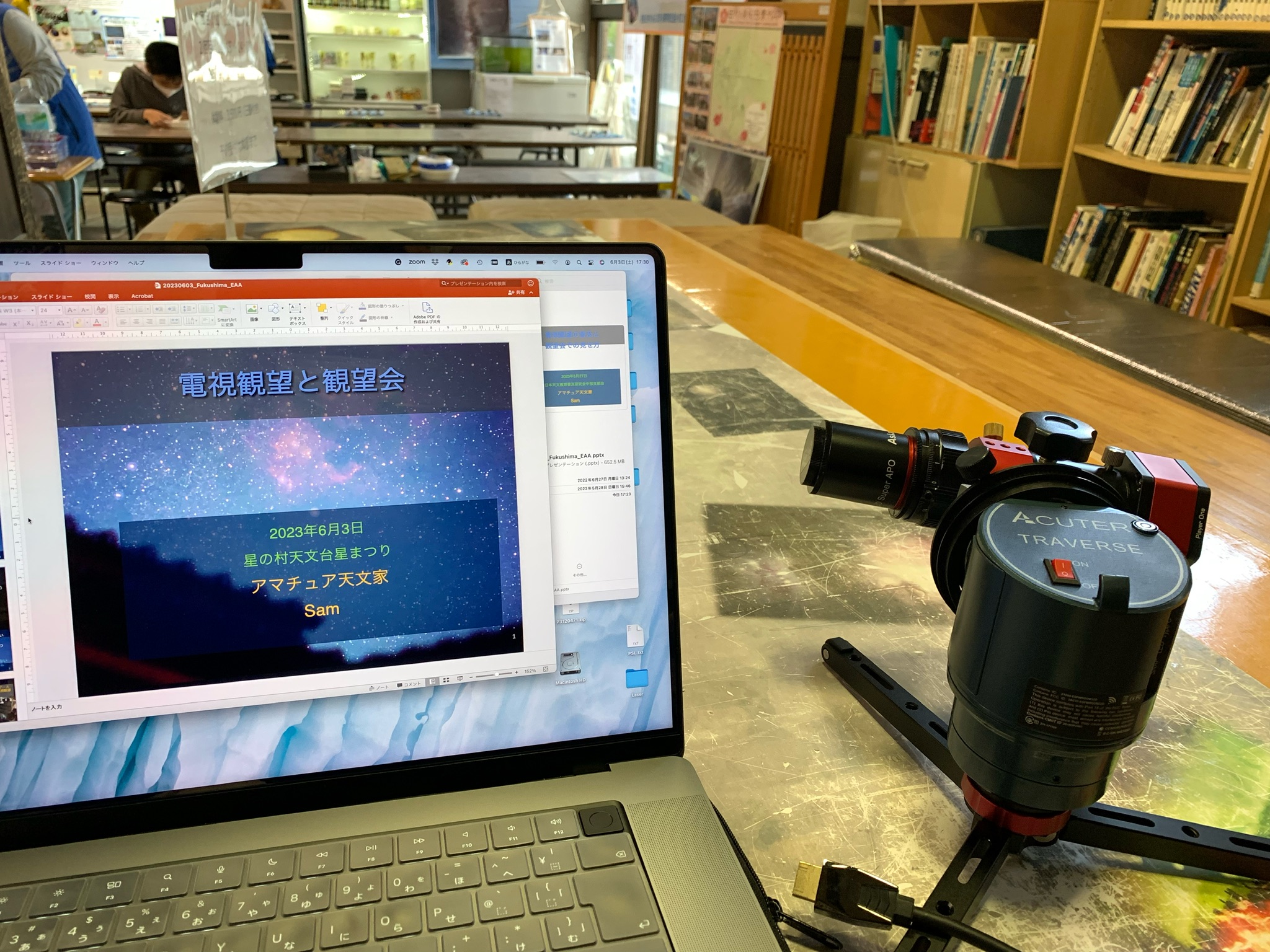 ちょうどこのブログの前の記事がM1 MacとArm Windowsでの電視観望だったので、せっかくだからM1 Macで試すことにしました。多分M1 Macで電視観望までやっている人は日本ではまだ私一人だと思うので、わかる人にはわかるセットアップで、結構受けていました。機材はいつものFMA135+Uranus-Cをトラバースに載せたミニマム電視観望セットです。あまりの小ささに、来た人みんな驚いていました。小さくて目立たないので、途中何度か気づかれずに蹴飛ばされそうになったり、鏡筒の前をブロックされてしまって、その度に「あー、そこ気をつけて!」とお客さんから声が上がっていました(笑)。