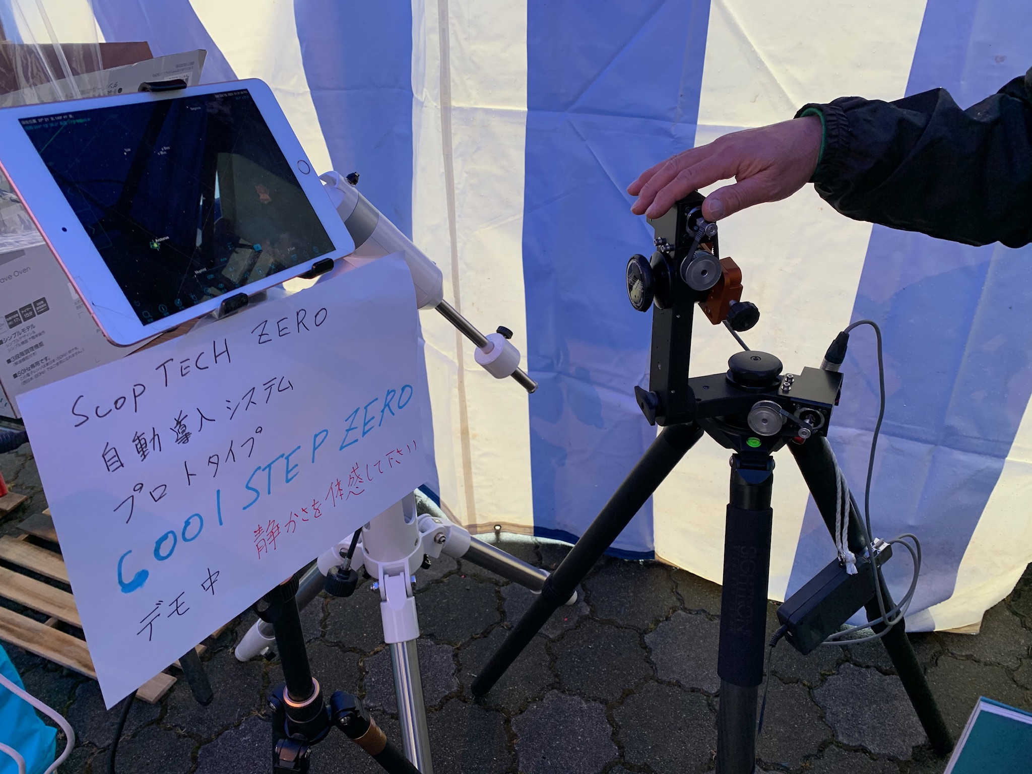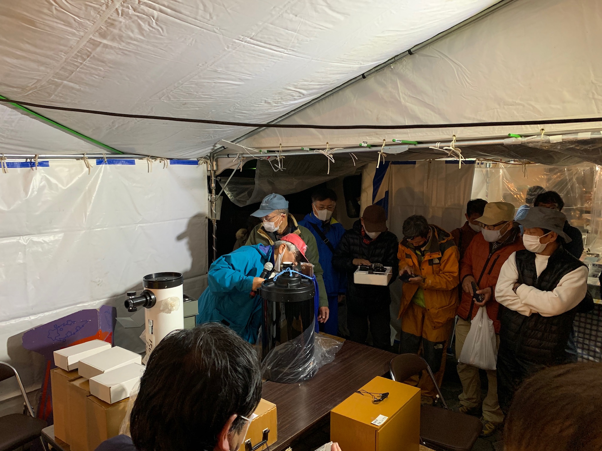 さて私はというと、元々は機材も出さずにおとなしくしてようと思っていました。ところが、ユニテックのスタッフさんから中高生の頃にNIKONの35mmのF1.4のレンズで撮影していたという話を聞いてしまったのです。「え?私、それまだ使っていますよ。今日持ってきてますよ。」と広角電視観望で使っている機材を車から持ってきたのが運のつきでした。「おー、これこれ!」とかなり盛り上がったのですが、その時ついでにFMA135とトラバースの通常の電視観望セットも持ってきてしまったので、結局暗くなる頃には電視観望の準備を始めることになってしまいました。