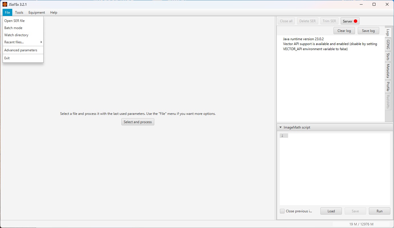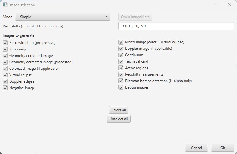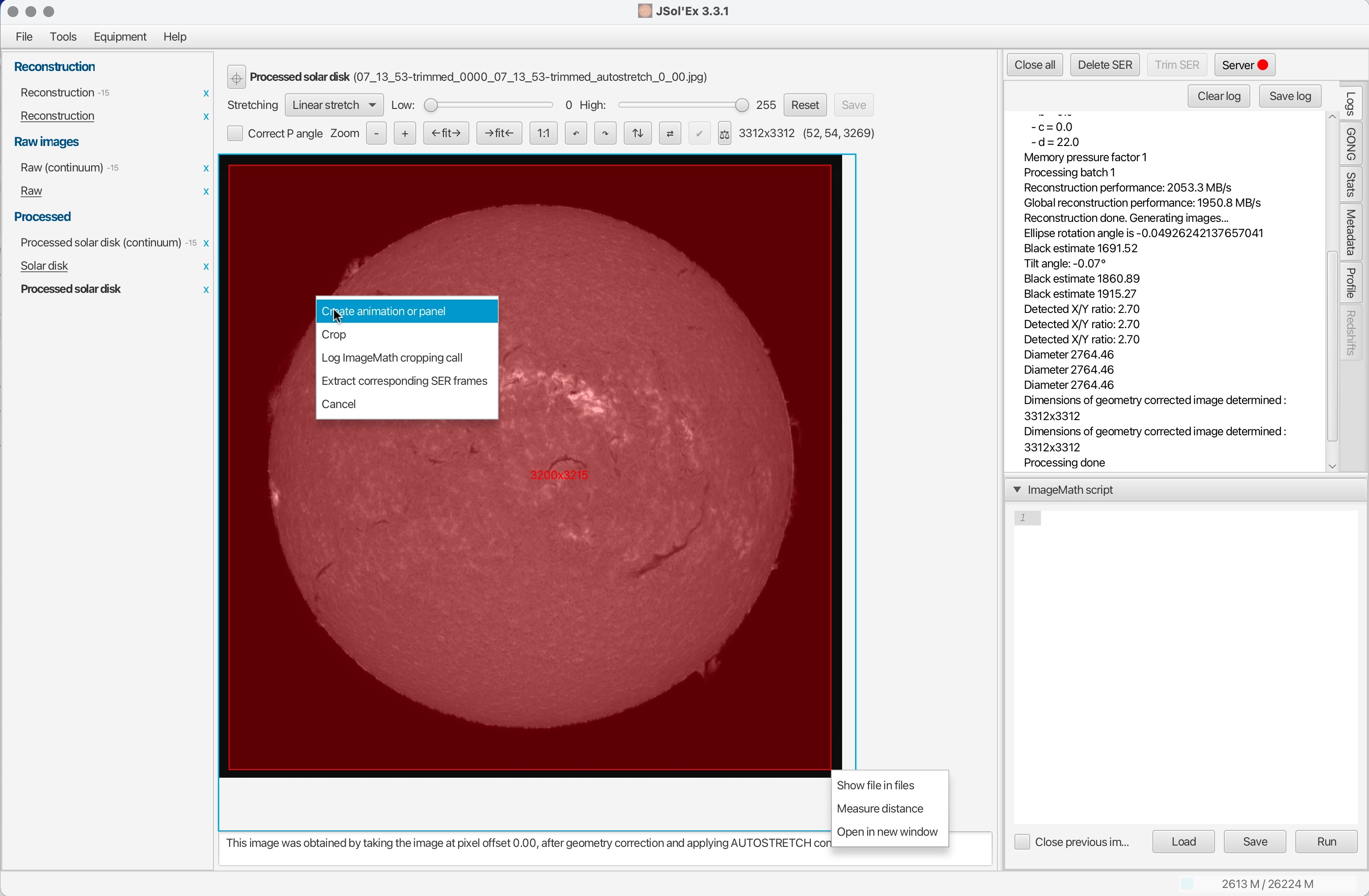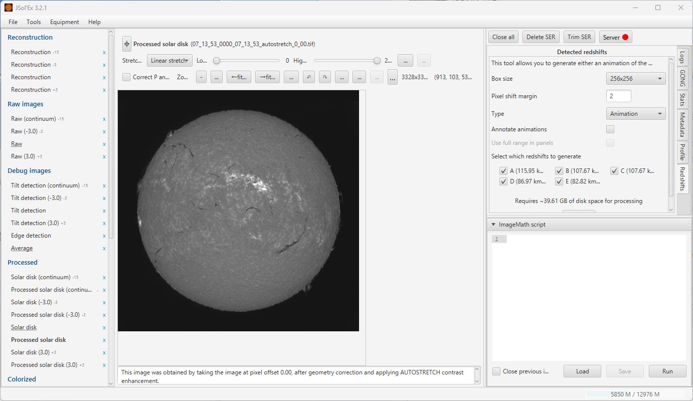 Image Math editorの「Ok」ボタンを押し元の画面に戻って、「Unselect all」を押します。これでImage Mathの処理のみが行われるので時間の節約になります。JSol'Ex上に処理された緯度経度情報が入った画面が表示されると思います。その後のスクリプトの改造ですが、この画面の右下にImageMath scriptという場所があって、そこに先ほどのソースコードの内容が表示されていると思います。ここをいじっていきます。
