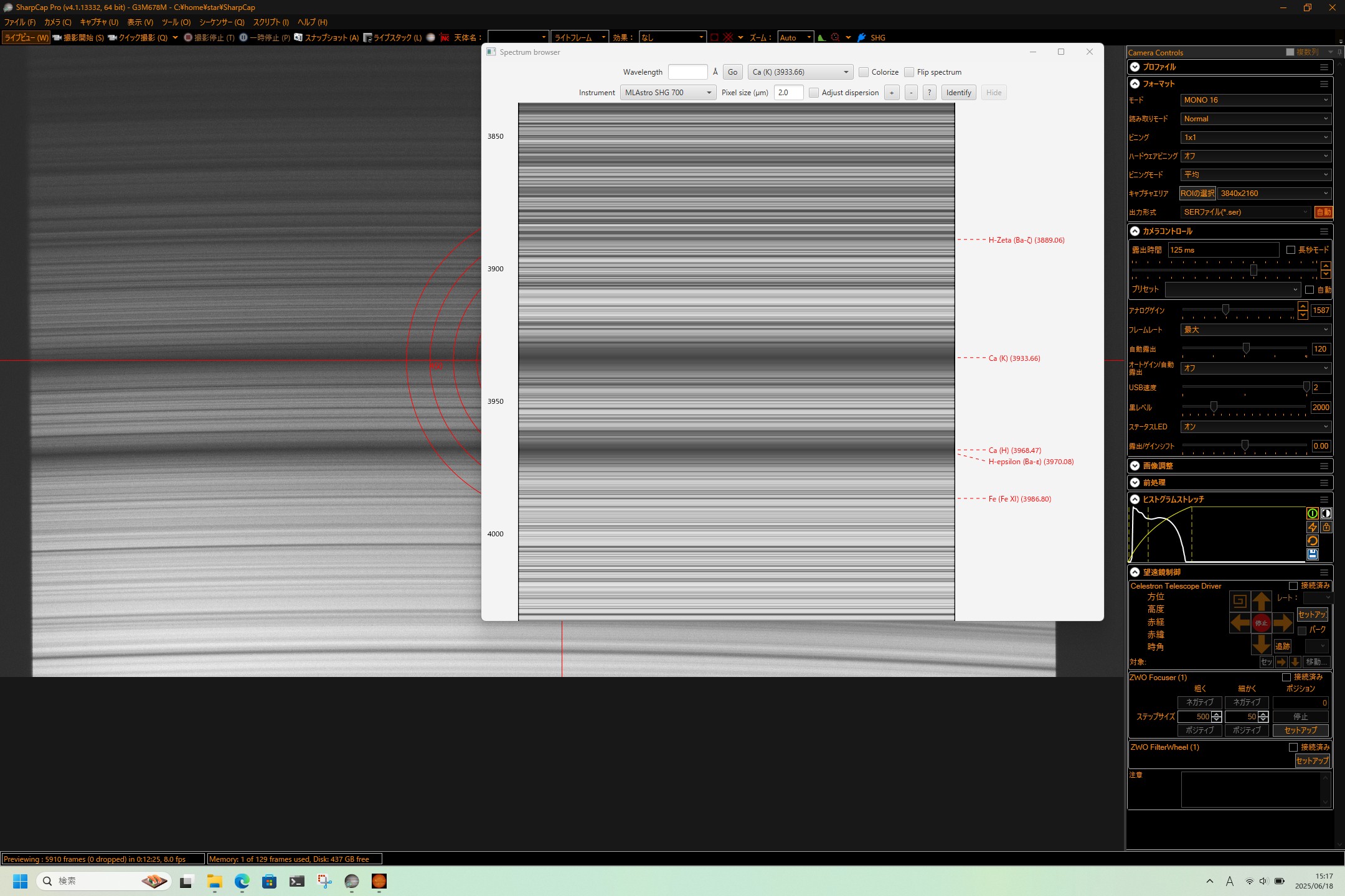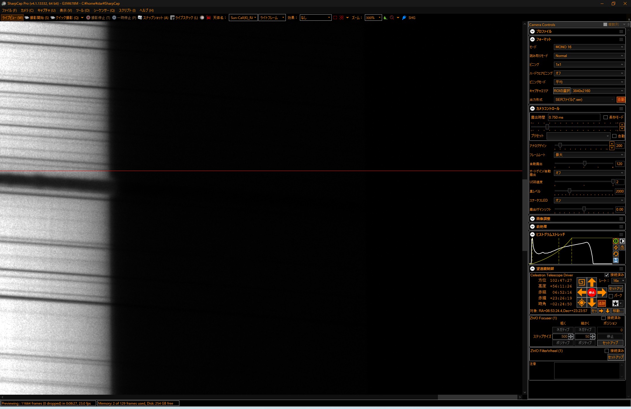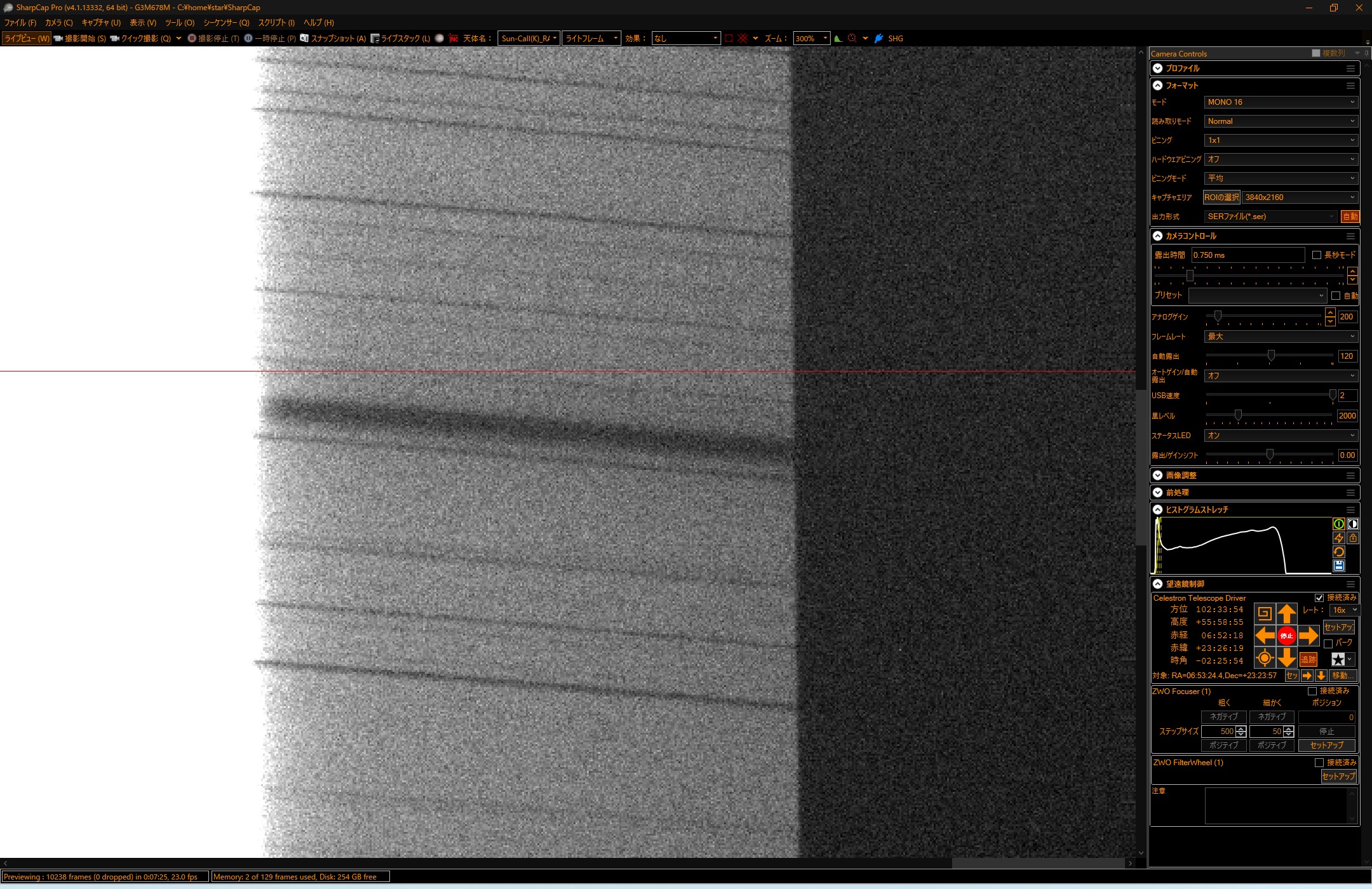- 撮影: SharpCap Gain 200 (=6dB)、露光時間1ms、ROI: 3840x100、平均381fps