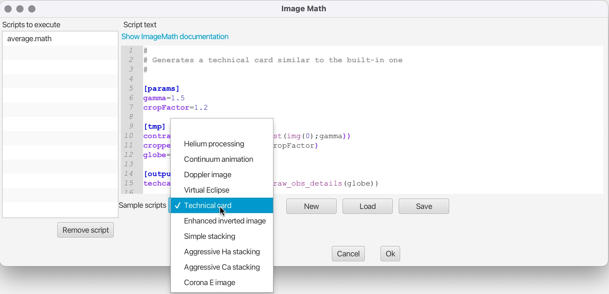 もし先ほどのスクリプトを保存していない場合は、ここであらためて「Technical card」を選択してもいいですが、SaveしてLoadせずに進めると何も読み込まれない状態になってImageMathの処理がされないので注意です。それから、ここで開いたサンプルファイル一覧では、「Tools」から「Image Math editor」から開いた場合で見たサンプルファイル一覧に出てくるものより少ないものしか出てこないので、これも注意です。なので、サンプルファイルは基本的にはメニューの「Tools」から辿って開くようにした方がいいいです。