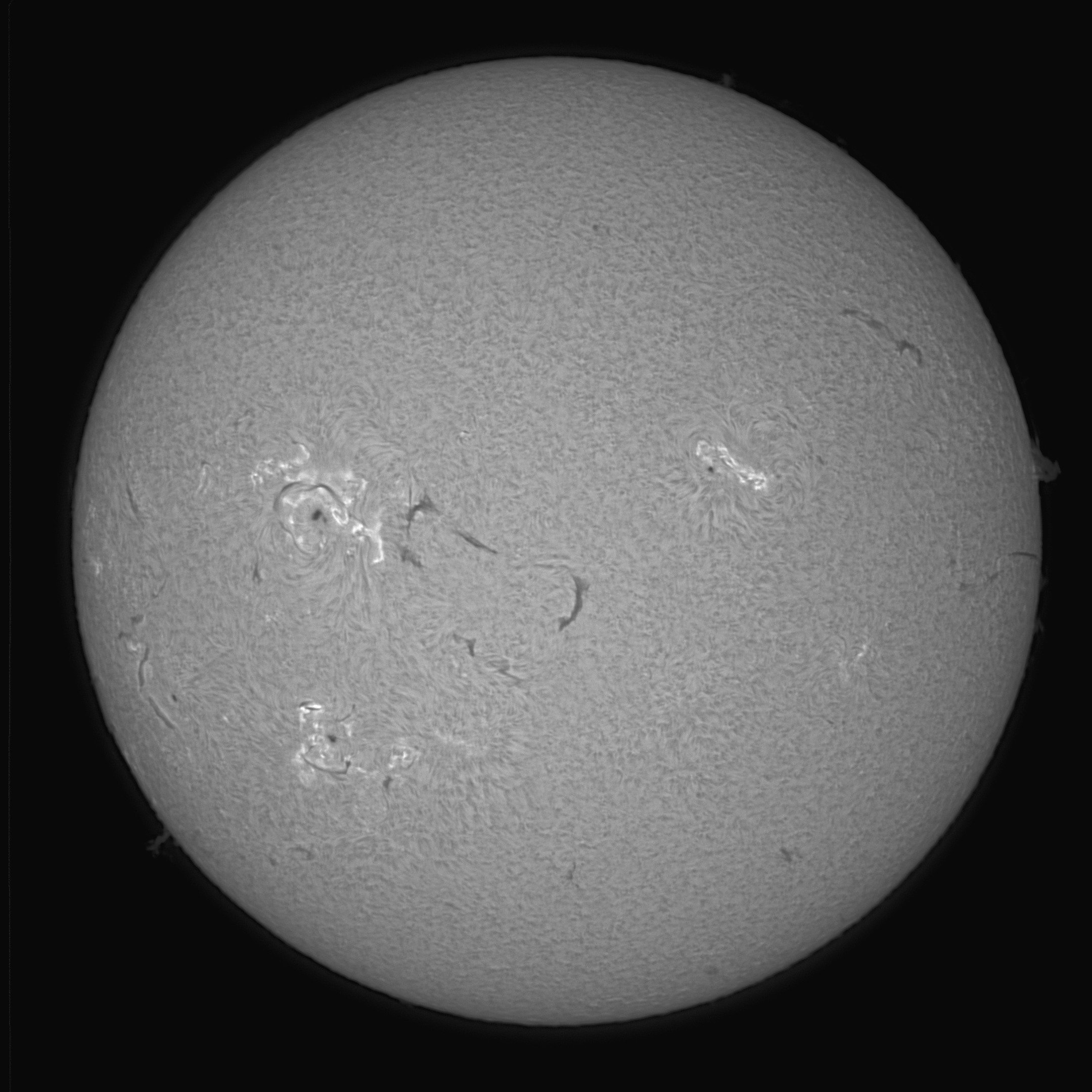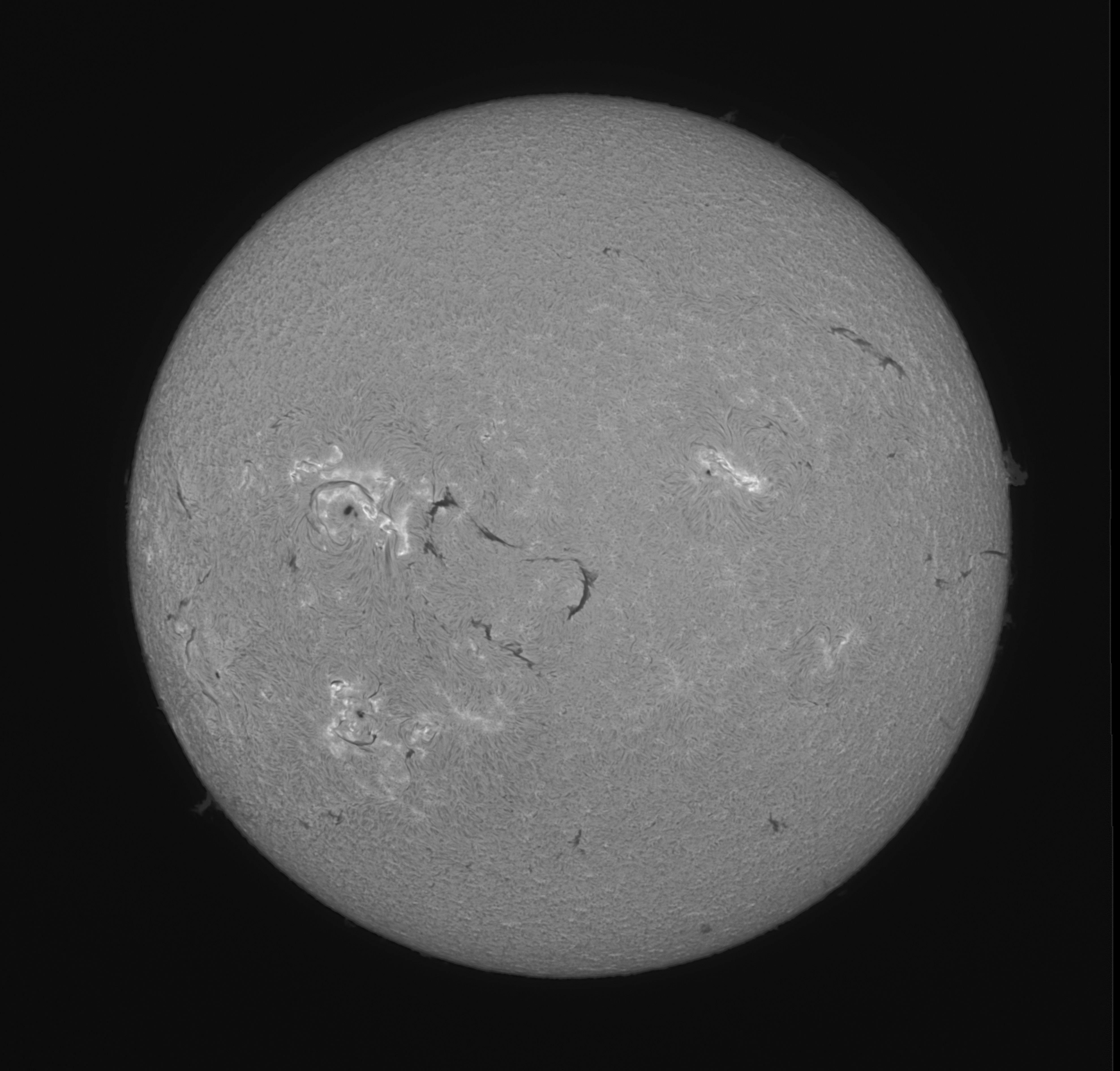 FWHMが大きいPSTながら、上の画像は太陽を全景でそこそこ撮れているので、すでにあまり不満はありませんでした。いわゆる典型的なHα画像で、太陽表面全体が「賑やかな模様」で覆われていて、その迫力を十分に楽しむことができます。