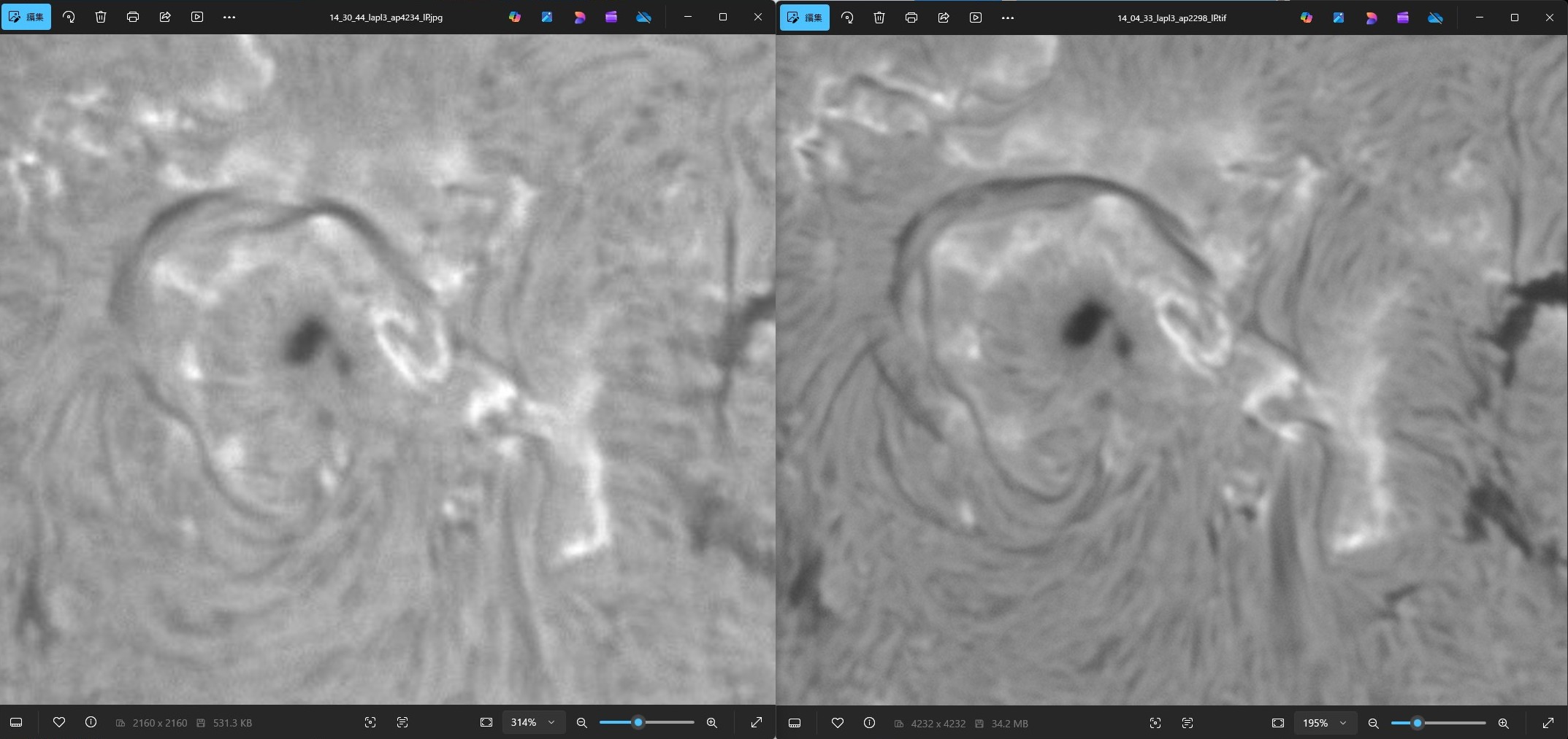 このように、Hα中心線にかなり近づいた時のみ出てくる、白いモヤモヤに見える何かが存在することはわかるかと思います。ちなみに、JSol'Exの標準スクリプトで処理される観賞用のHα画像は、中心波長だけだとのっぺりして面白みがないのか、中心波長に周りの波長を少し加えて多少見栄えがするように仕上げたりしています。
