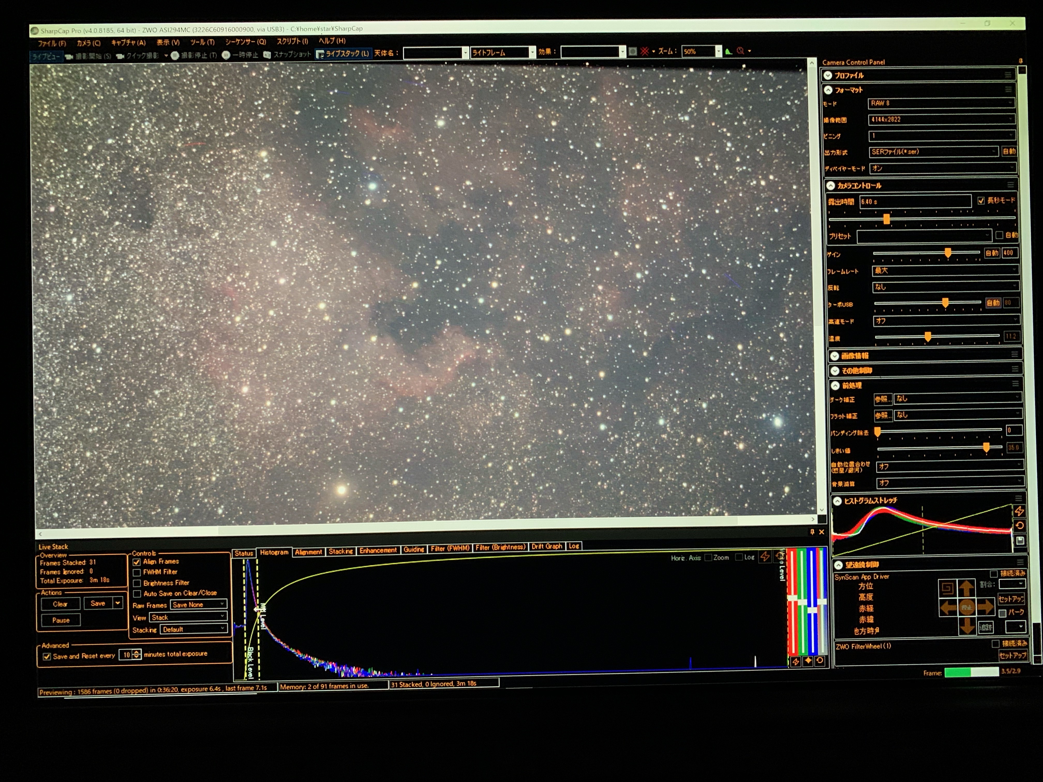 5分x29枚で合計2時間25分のL画像で撮影時間は全然短いのですが、背景のモクモクは遥かに出ているがわかるかと思います。こちらはまだABEとかかける前です。さすが開田高原の暗い空です。
