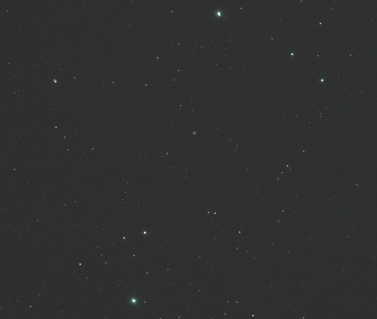 実際にはもっと明るい20時前でも十分見えていました。自動保存されているM57の画像ファイルの一番早いタイムスタンプを見たら19時55分でした。いい例なので載せておきます。スタックなしの0.8秒露光の1枚画像なのでかなりノイジーですが、それでもM57の存在は十分わかります。