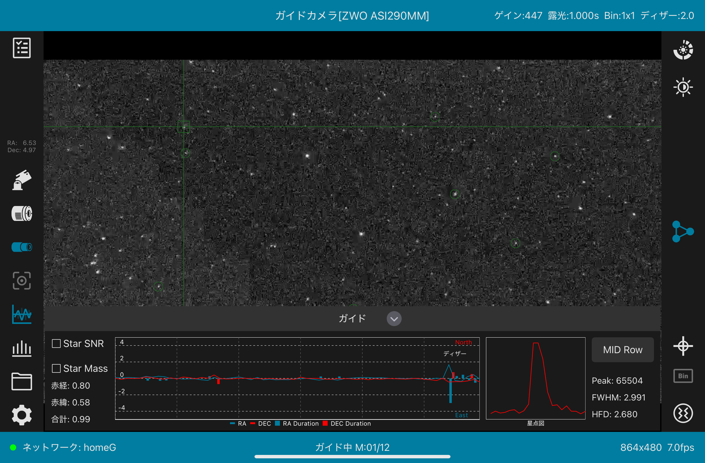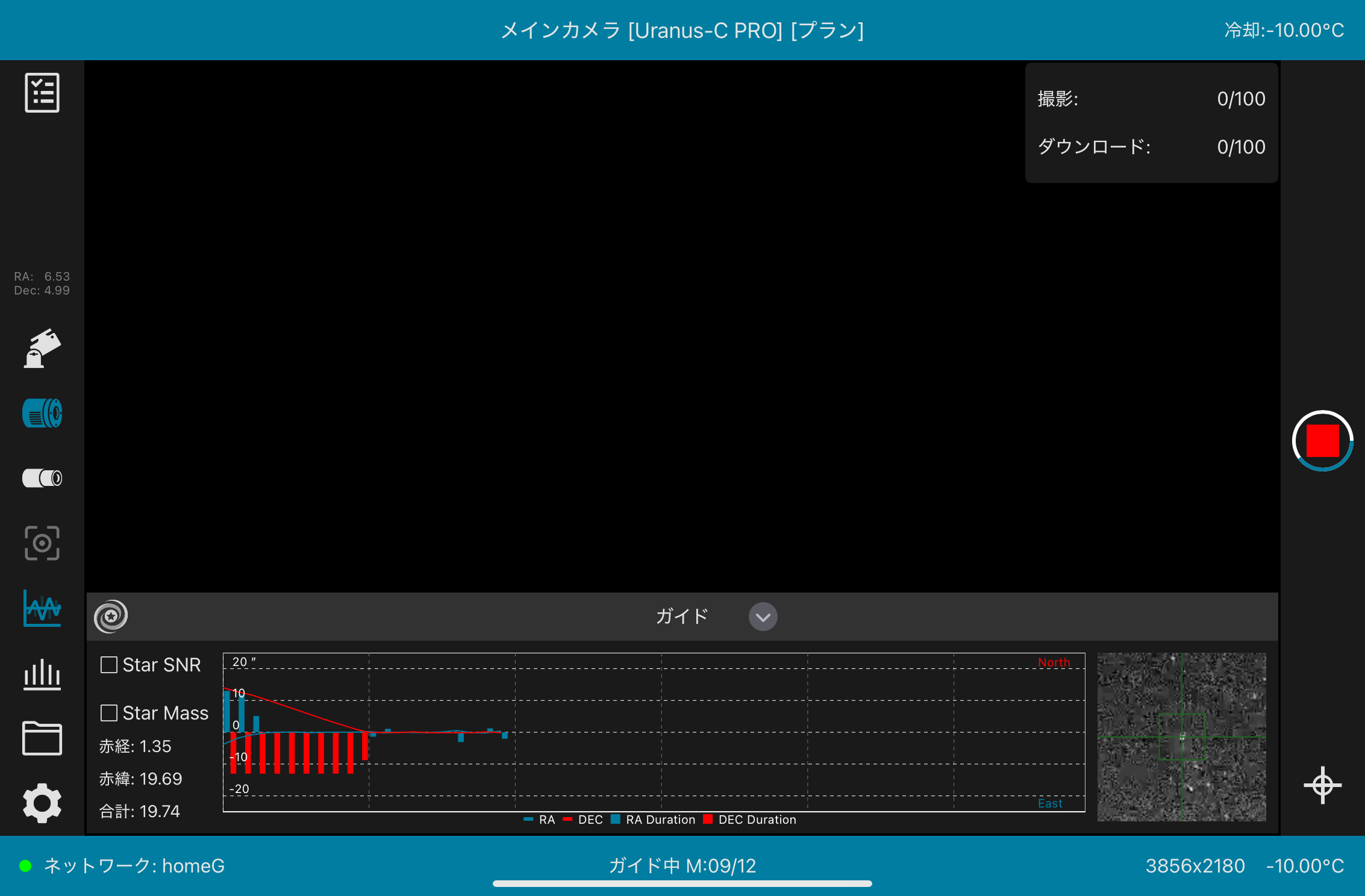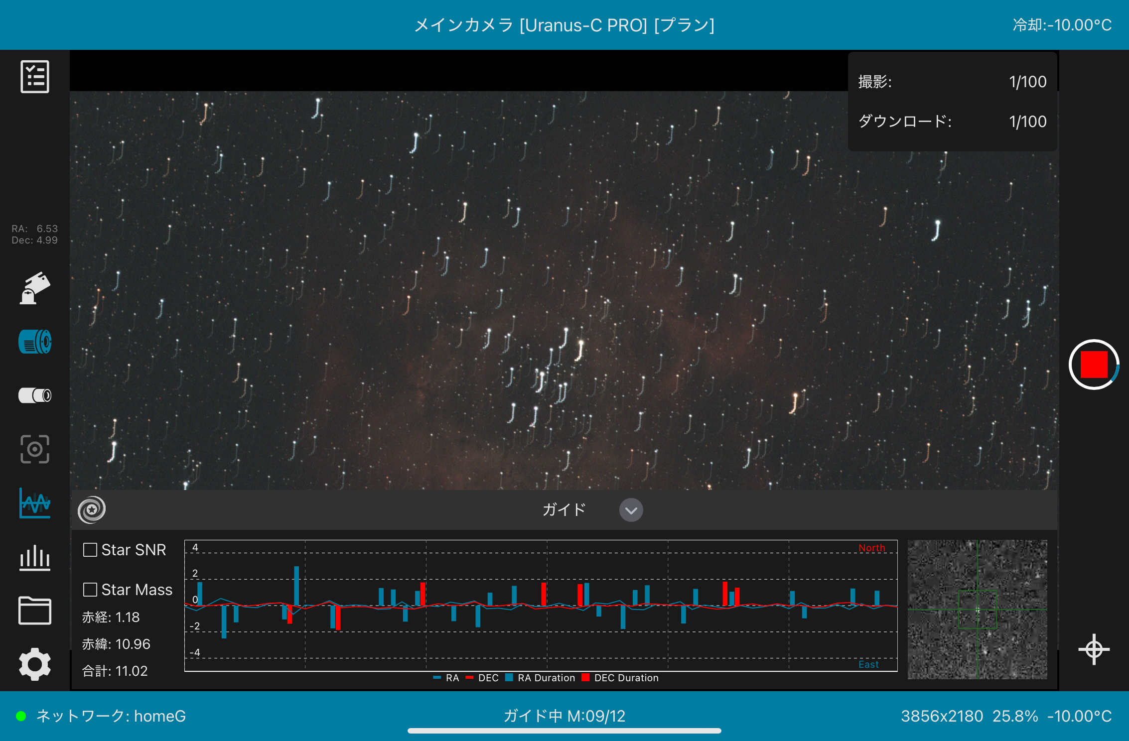 ところが、ガイドをオンにしたはずなのに、ガイドが入らないことが2度ありました。判別方法としては、ガイドカメラの画面に切り替えた時に星が何も写っていなくて真っ暗のままの場合はガイドが開始されません。どうもガイドカメラがアプリ上では接続はされているにも関わらず、うまく動いていないことがあるようです。この場合、ガイドカメラをアプリ上で一旦接続をオフにして、もう一度オンにすると画面に星が写って、その後撮影開始後にキャリブレーションが始まりました。