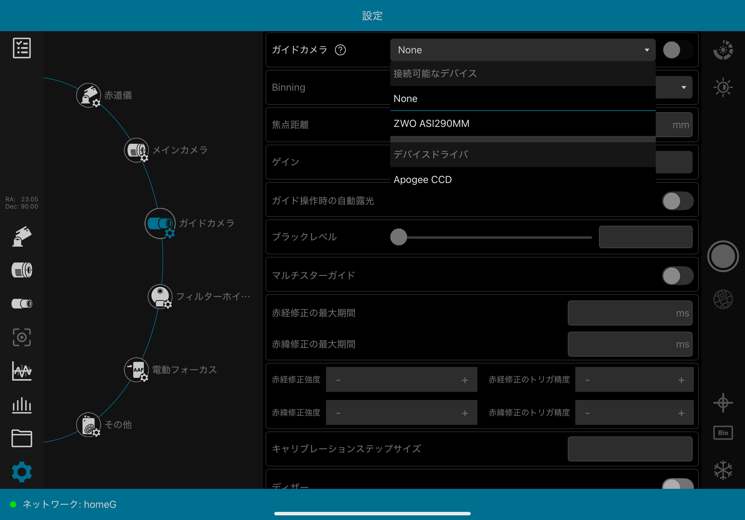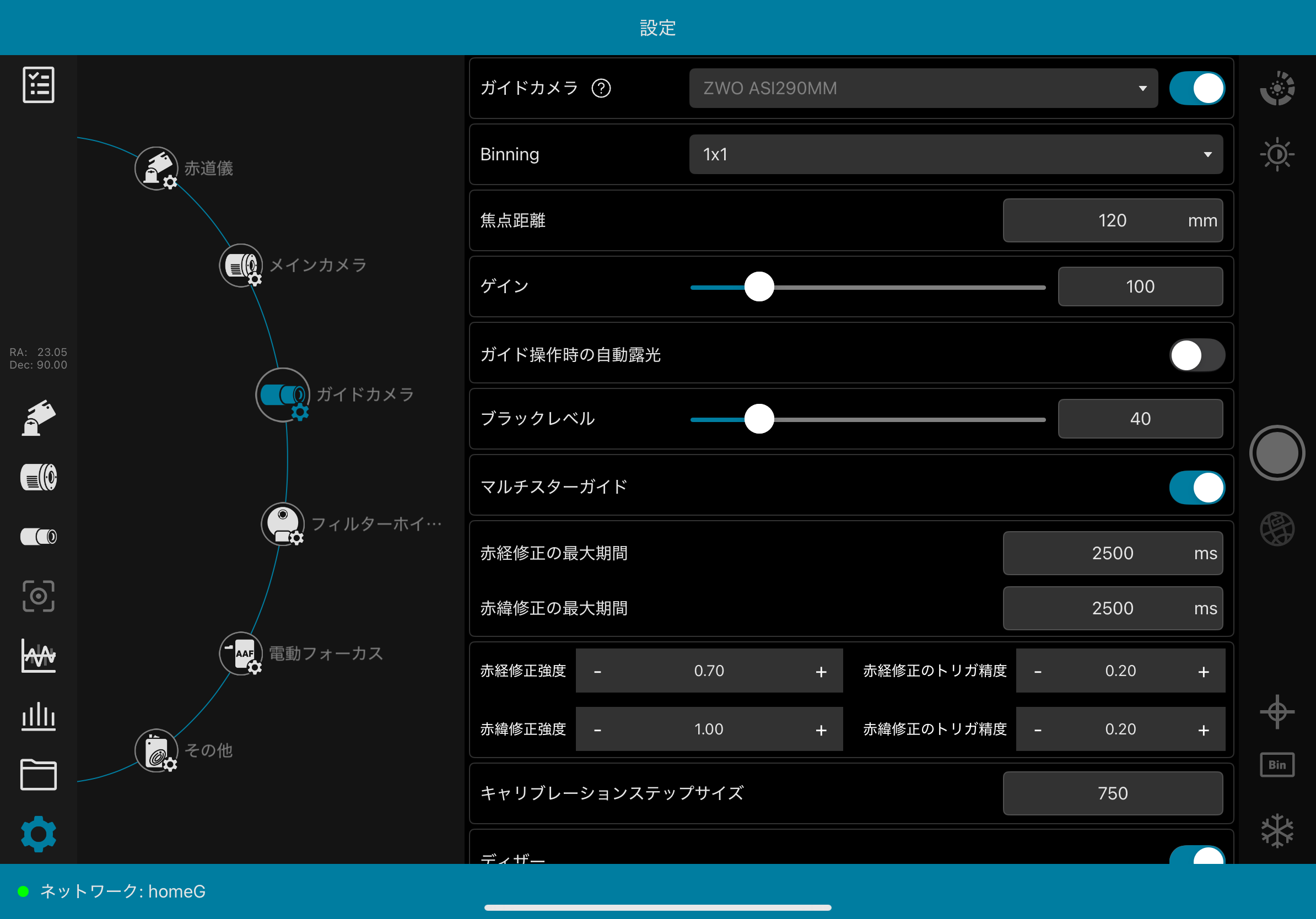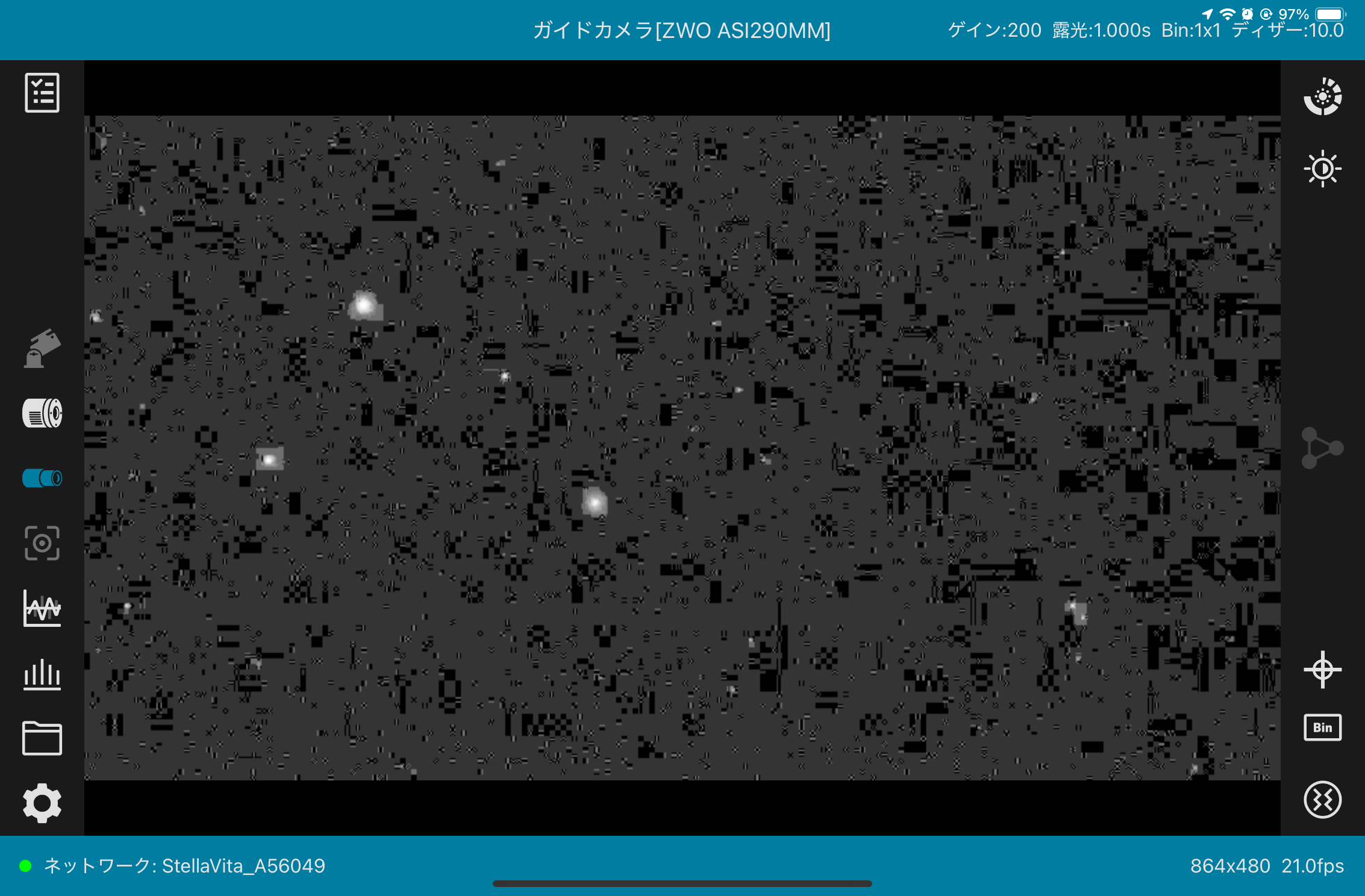 ところが、ガイドをオンにしたはずなのに、ガイドが入らないことが2度ありました。判別方法としては、ガイドカメラの画面に切り替えた時に星が何も写っていなくて真っ暗のままの場合はガイドが開始されません。どうもガイドカメラがアプリ上では接続はされているにも関わらず、うまく動いていないことがあるようです。この場合、ガイドカメラをアプリ上で一旦接続をオフにして、もう一度オンにすると画面に星が写って、その後撮影開始後にキャリブレーションが始まりました。