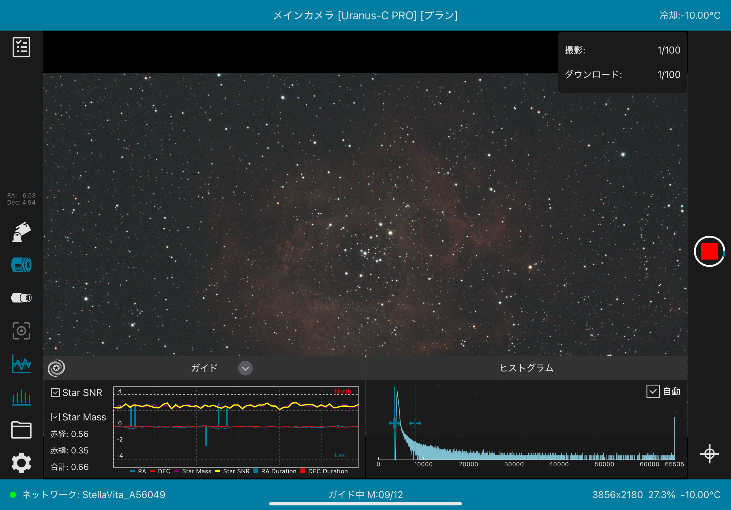撮影時のメインカメラの画像に、同時にガイド画面とヒストグラムを表示するとができます。ガイド画面では安定度を見ることができ、ヒストグラムでは「自動」にチェックが入っていればオートストレッチされた画像が表示されるので、ある程度の写り具合を見ることができます。