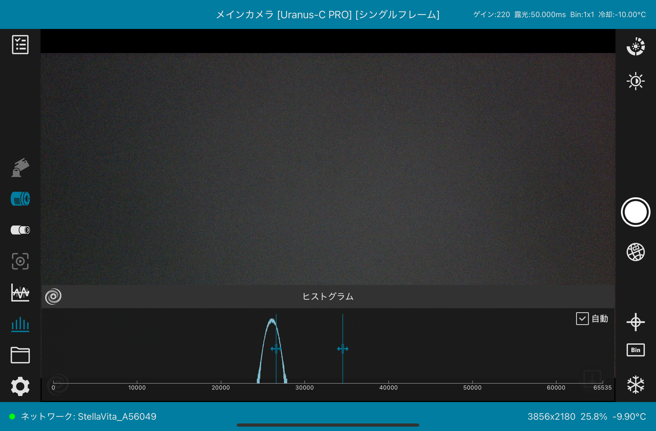 露光時間の調整は、メインカメラボタンを押してメインカメラの画面を出し、さらにもう一度メインカメラボタンを押して、シングルショット撮影を選んびます。ゲインはからなずライト撮影時と同じにしてください。明るさの調整は露光時間で行います。露光時間は右の上から2つ目のアイコンを押して調整します。その後、右真ん中のボタンを押して実際に撮影してみます。左の櫛形のアイコンを押してヒストグラムを出し、山が真ん中か少し左くらいにある状態になるように何度か露光時間を調整と撮影を繰り返します。今回は曇りの時の部屋の中で0.05秒でちょうどいいくらいの明るさになりました。