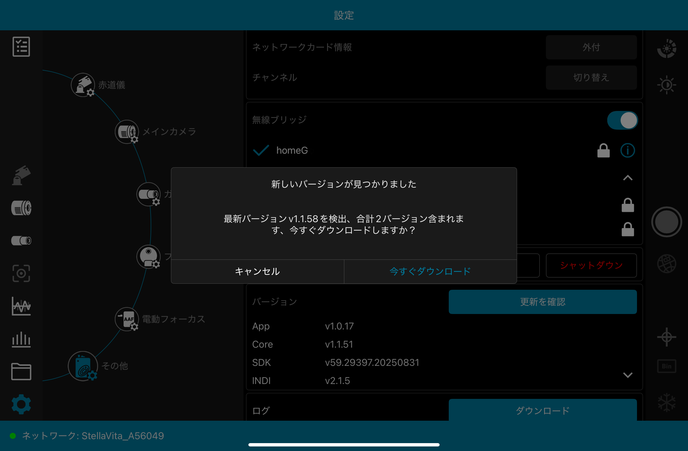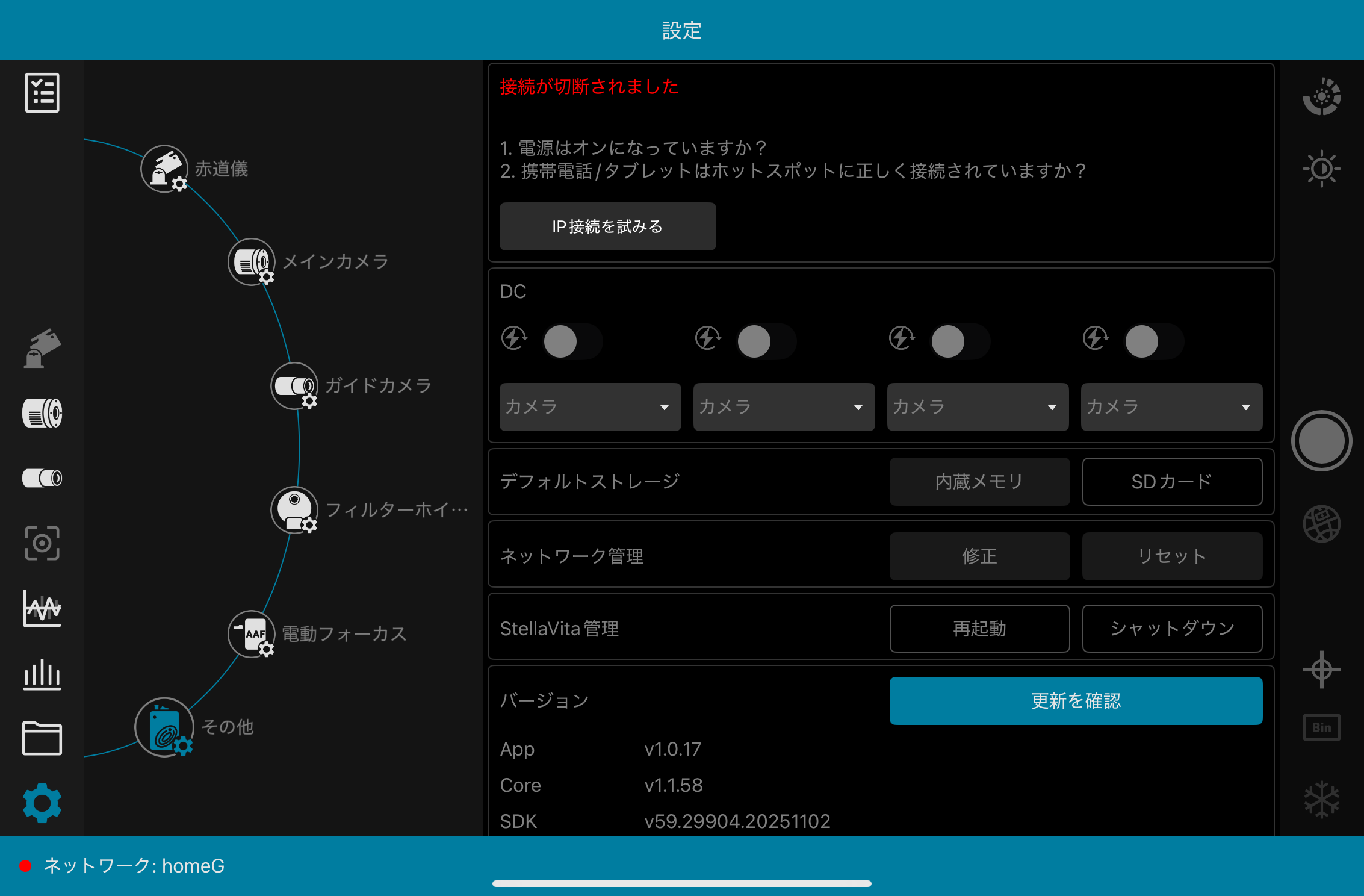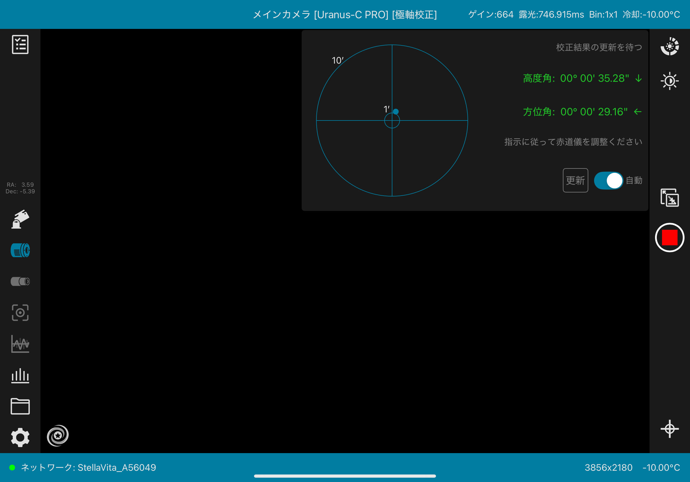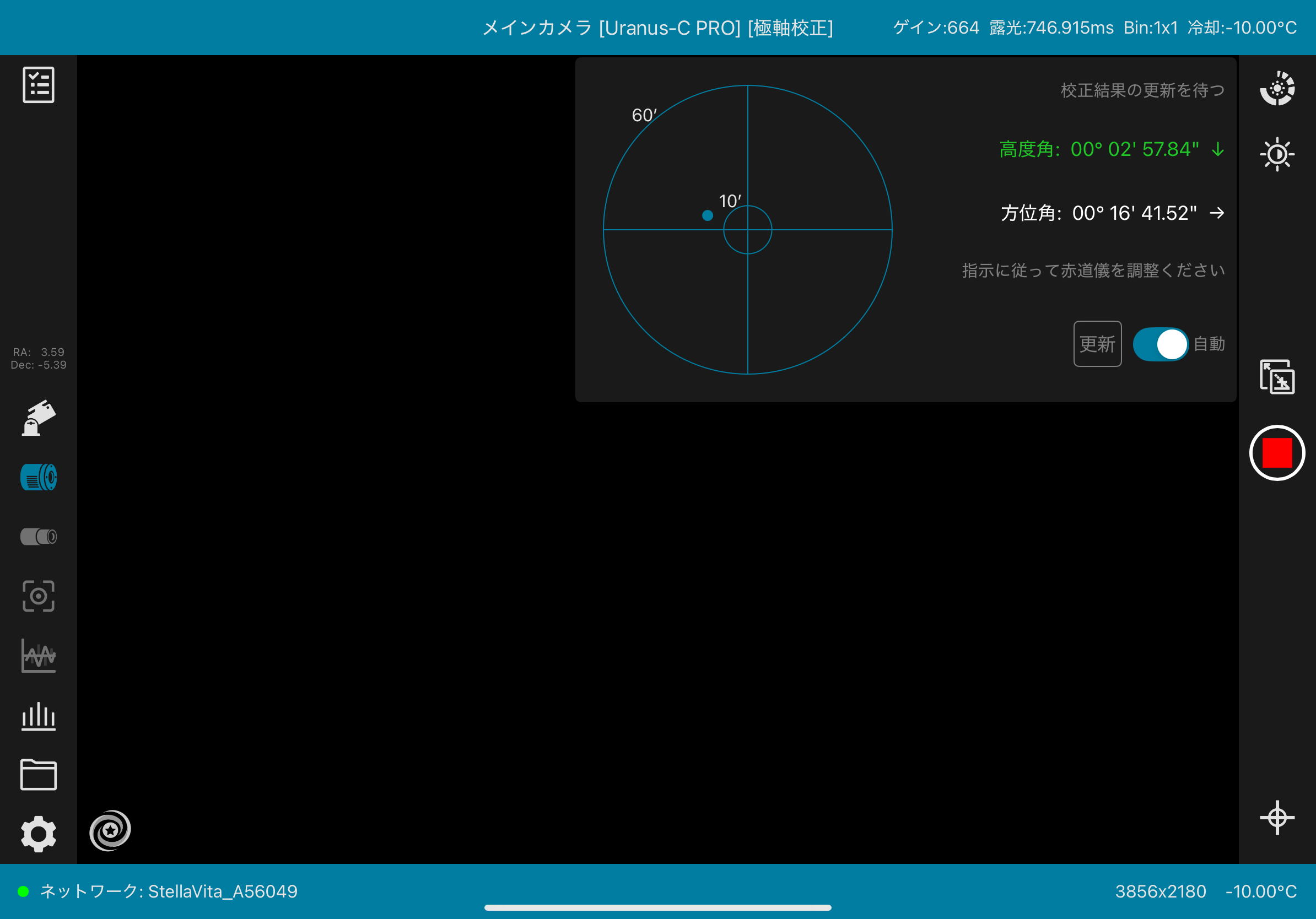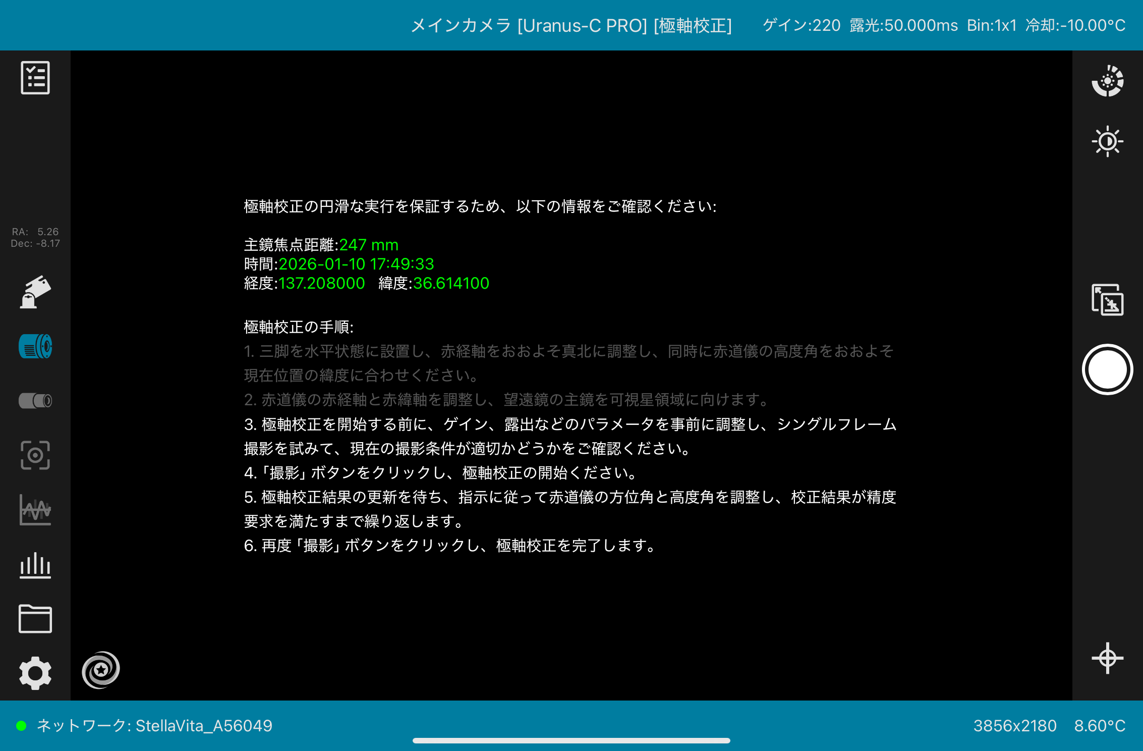 StellaVitaでは極軸調整にメインの撮影カメラを使います。すでに上記のテスト撮影は終わっているとします。極軸調整にはメインカメラで星を写してその画像を解析する必要があるので、まだテスト撮影をしていない場合は、極軸調整の前に実際一度試してみてください。