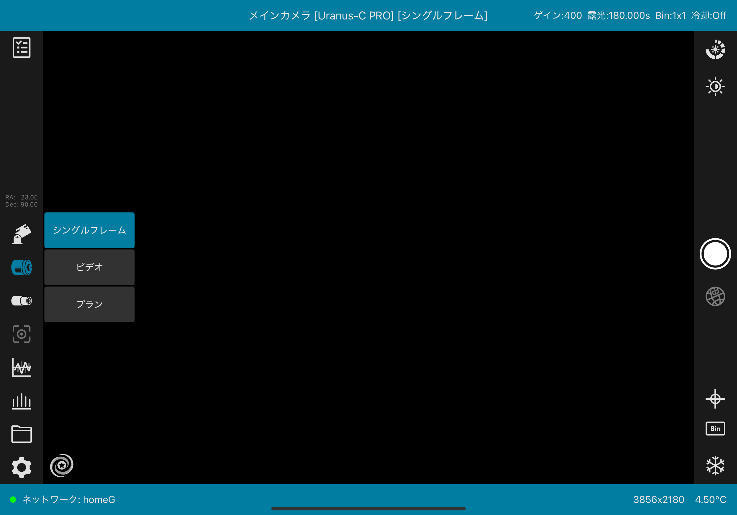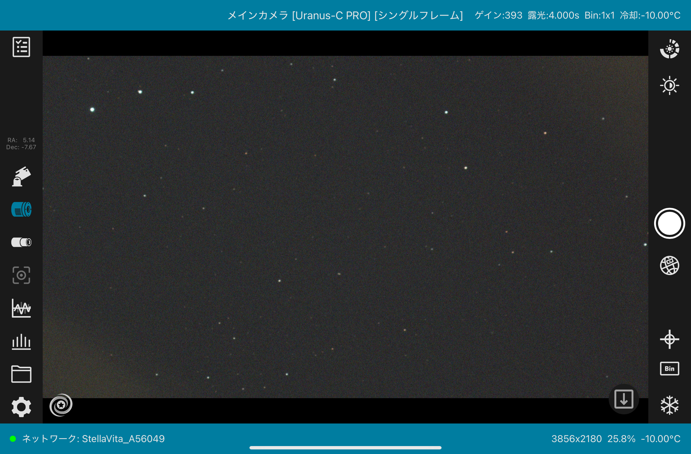 右の真ん中の撮影開始ボタンを押して、まずは1枚撮影してみます。カメラの露光時間は短くしておいた方がいいでしょう。数秒でいいかと思います。右の撮影アイコン周りに円形のバーがぐるっと進む様子がわかると思います。最後までたどり着いたら撮影終了で、撮影した画面が映し出されます。