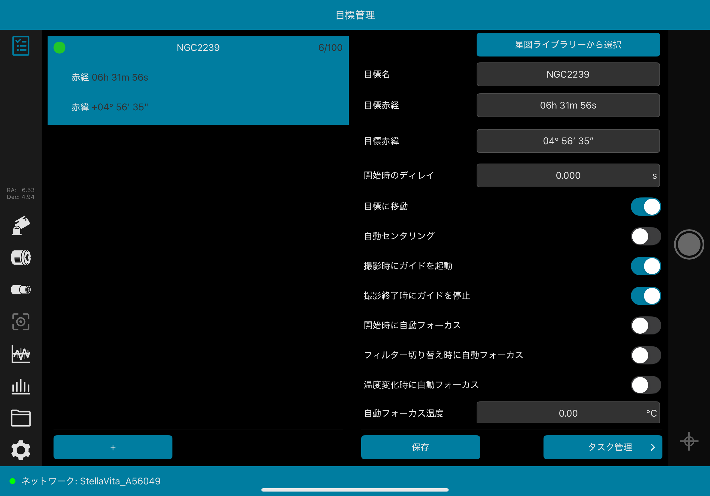 再び左上のTodoリストアイコンを押して「タスク管理」->「目標管理」に入って、今調整した露光時間を入力します。これで準備は完了です。