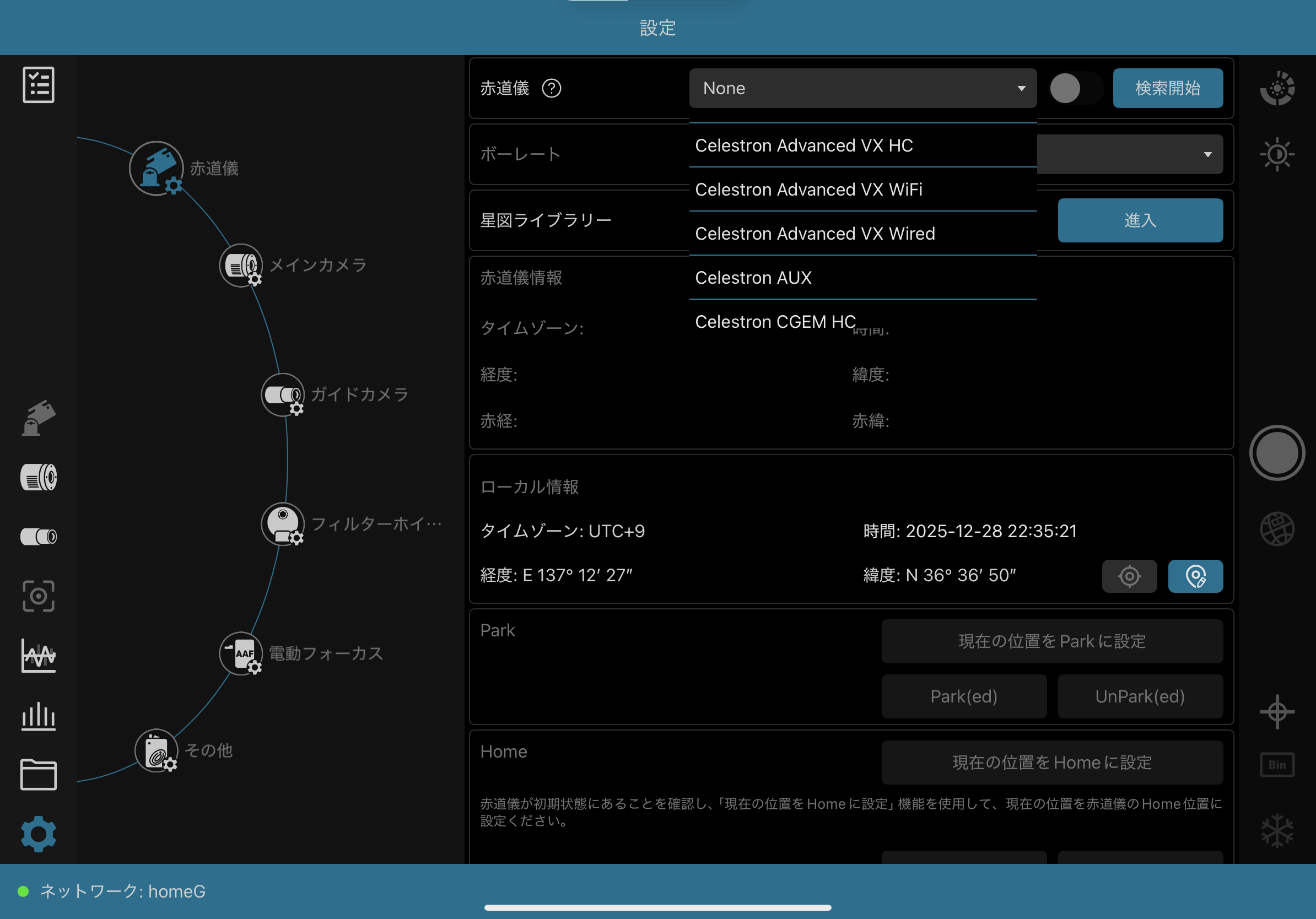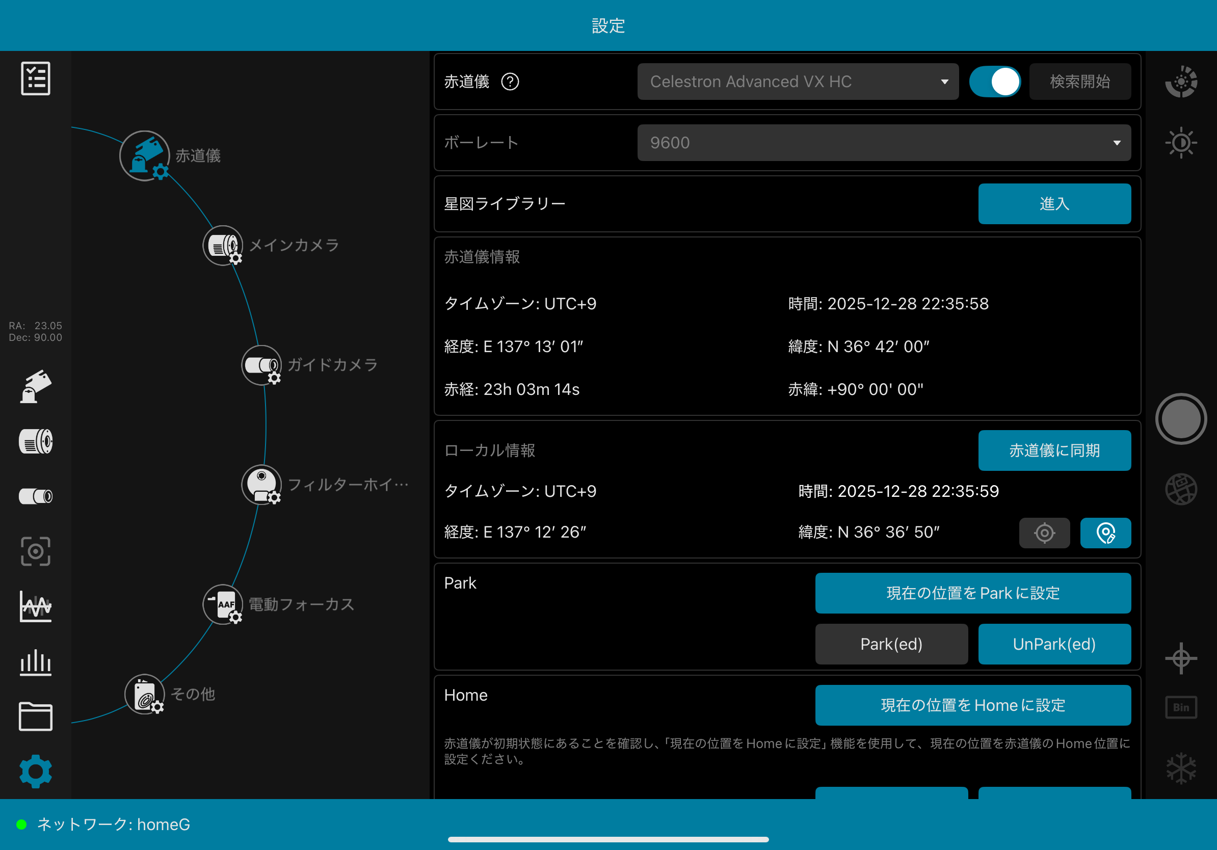 ここで、赤道儀と「同期」するかどうかの選択肢がでてくるので、一旦赤道儀と同期しておくのがいいでしょう。これで近傍の天体導入なら、そこそこの精度でできるはずです。ただし、遠くの天体の導入と、撮影時の追尾はまだ精度がありません。これまでにまだ極軸調整をしていないからです。