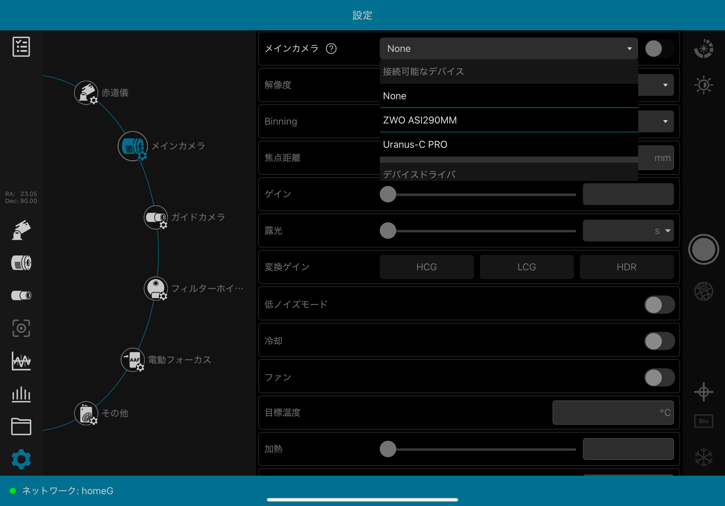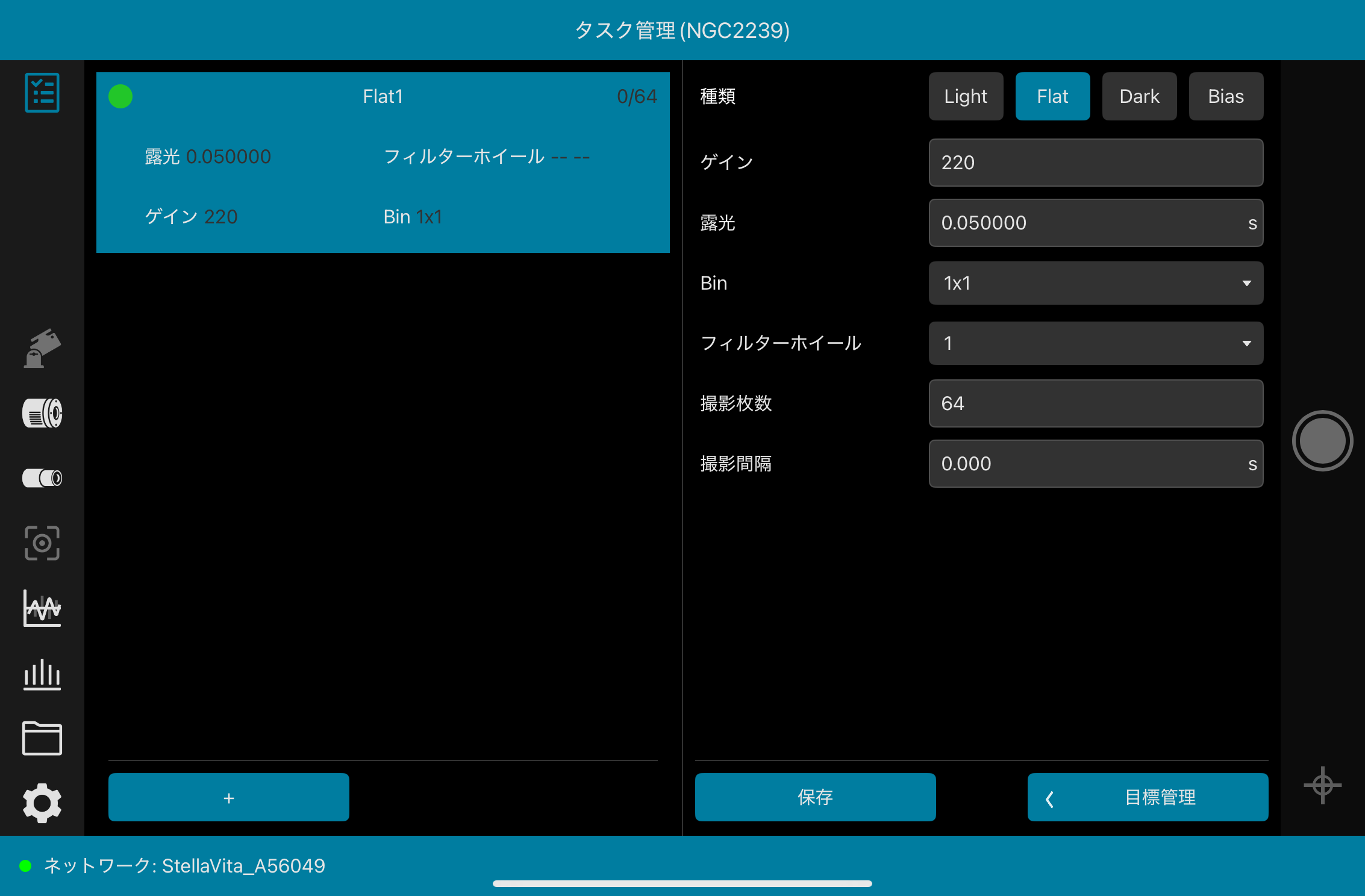 StellaVitaの電源投入後、アプリ接続して、今回はメインカメラのみをオンにします。ライト画像と同じように、左上のTodoリストアイコンを押し、「タスク管理」で作ったNGC2239の「目標管理」にタスクを追加します。ただし、ライト画像のタスクが残ったままだと撮影時にライト画像から再び撮影してしまうので、まずはライトの「Light」のタスクを消して、改めて「Flat」を選択して、ライト画像と同じゲインにして、露光時間を調整します。