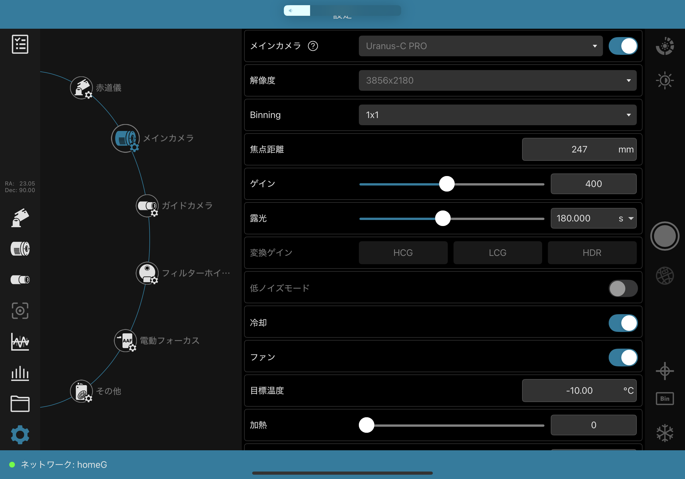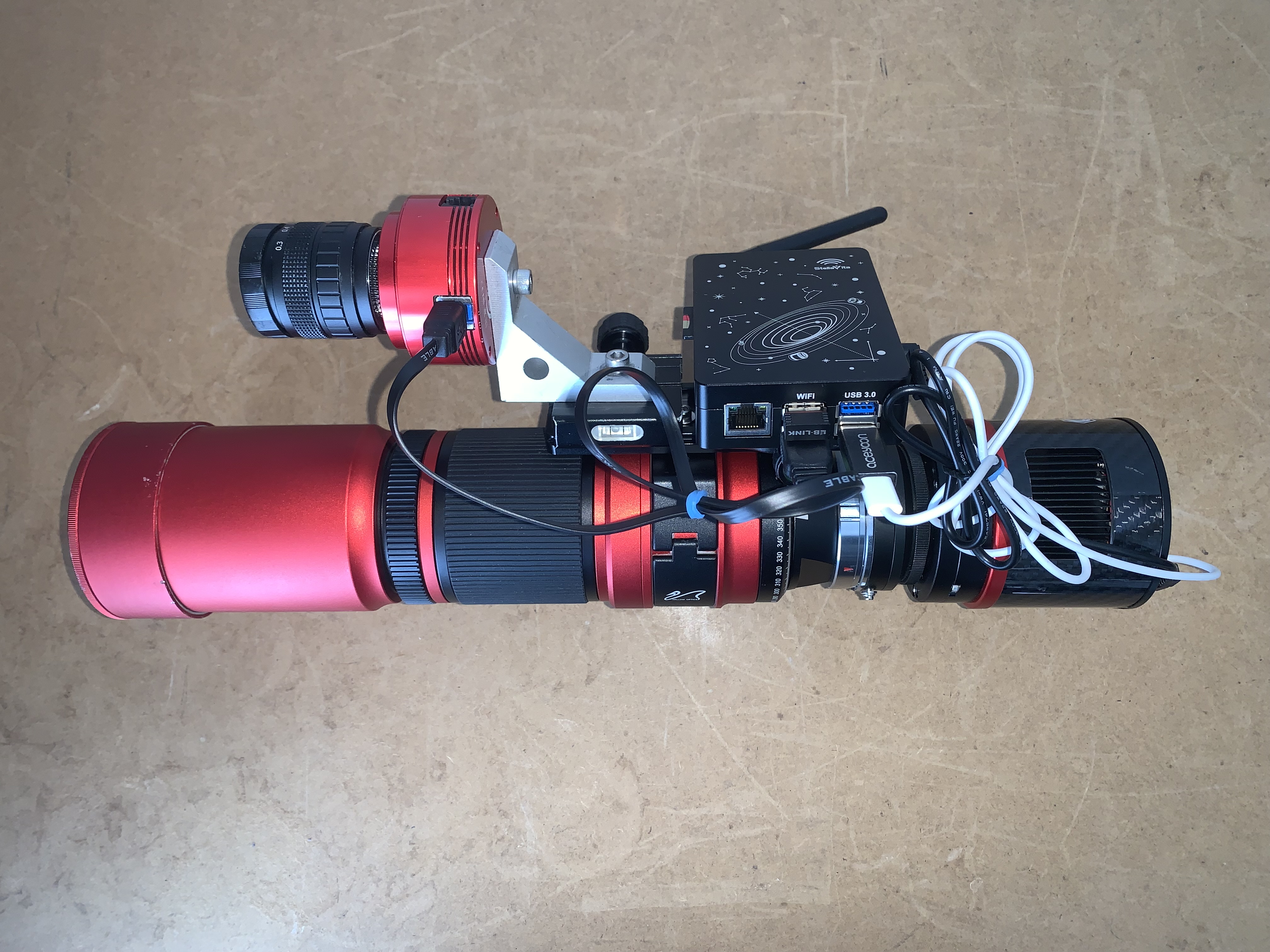 前回記事の終了時の、赤道儀とカメラとガイドカメラが使えるようになった状態から始めることにします。カメラとガイドカメラのピントも取れているとします。