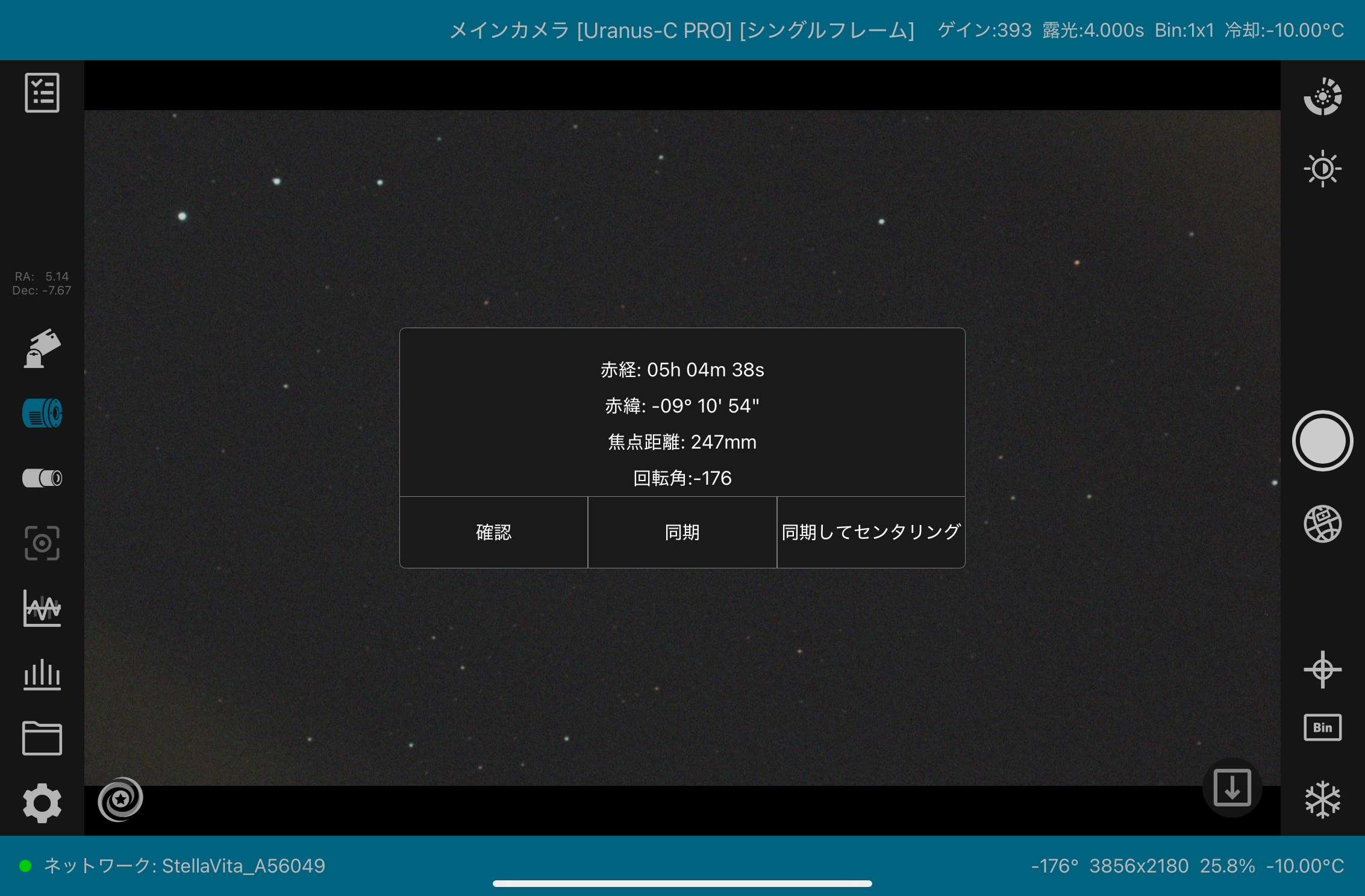 撮影画面が見えたら、早速プレートソルブを試して、取得画像からいま鏡筒がどの方向を見ているかを特定してみましょう。画面の右アイコンの撮影ボタンの下の「地球のようなマーク」を押し、プレートソルブでの解析を開始します。試した限り、StellaVitaではかなり安定にプレートソルブができるようです。