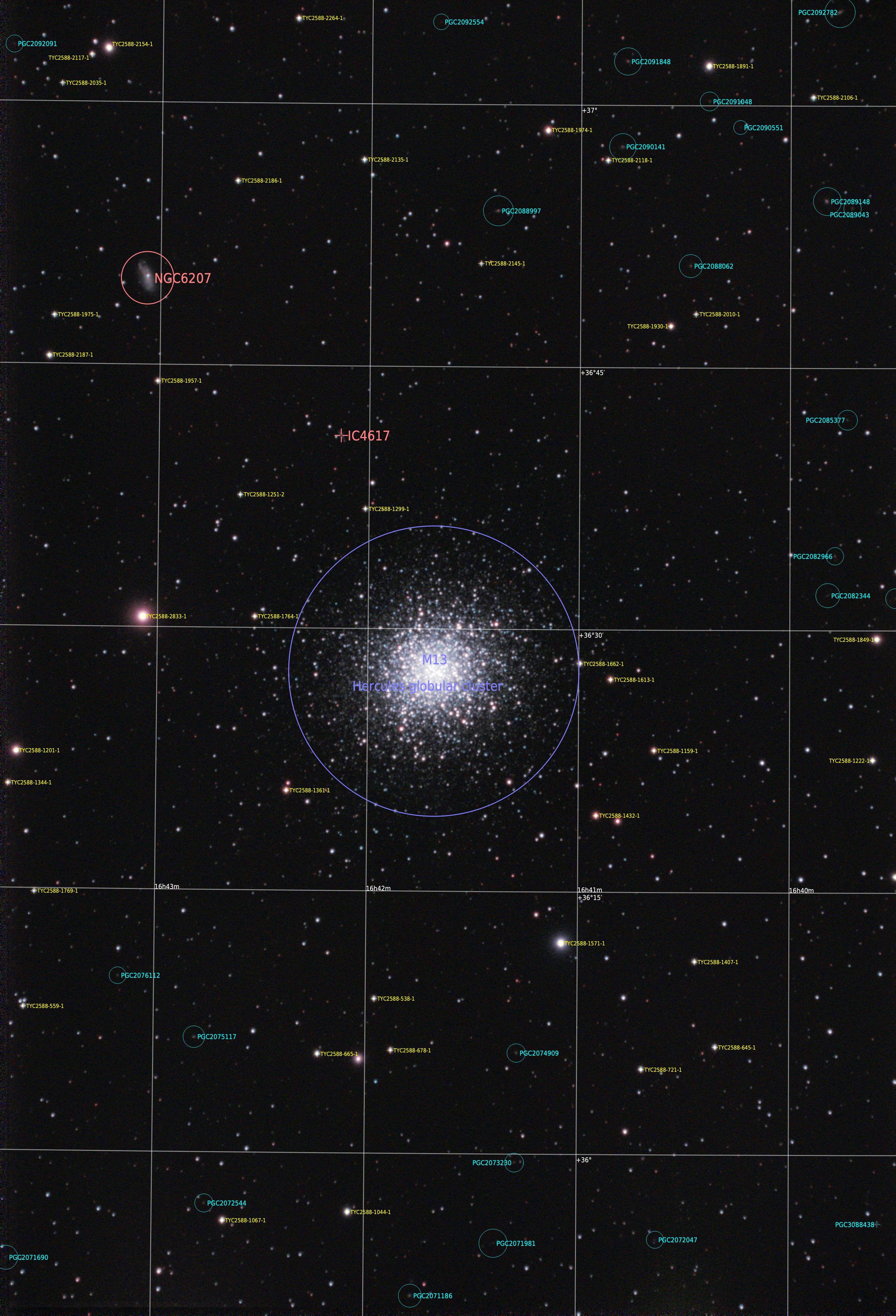 - 撮影: NINA、Gain 200、露光時間1分、64枚、R:11枚、G:24枚、B:58枚で総露光時間3時間1分dark: Gain 200、露光時間1分、L:88枚、flat: Gain 200、露光時間0.2秒(L)、0.5秒(RGB)、L:256枚、RGB各:128枚、flatdarkはLRGB共通: Gain 200、露光時間0.2秒、128枚